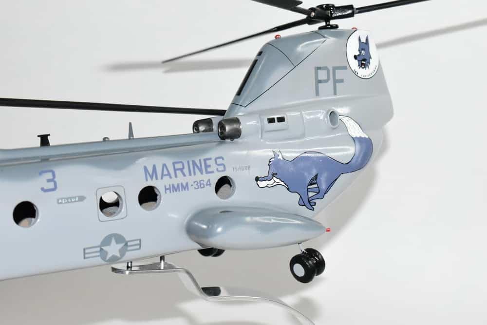 HMM-364 Purple Foxes CH-46 (2012) Model Fly with the Purple Foxes of HMM-364 in this handcrafted CH-46 Phrog model. Each model is carved from wood and hand painted to provide a unique piece that will always be treasured. Artwork created by Flygirl Painter (Shayne Meder) Length - 14 inches Made from Mahogany US Naval Aviator Owned Business Early years Marine Medium Helicopter Squadron 364 was originally commissioned as Marine Light Helicopter Squadron 364 (HML-364) on September 1, 1961 at Marine Corps Air Facility Santa Ana, California. In November 1961, it received its first Sikorsky H-34 helicopter and in February 1962, the designation of the squadron was changed to its present title. In the spring of 1962, the squadron participated in Mid-Pacific operations to assist in recovering instruments that had been used in the atomic test program. Vietnam War In November 1963, the squadron deployed to Okinawa and subsequently to Da Nang Air Base, Republic of Vietnam. The squadron served in Vietnam until July 1964. Eight months later the squadron was back in South Vietnam, this time conducting operations, including operations with the Special Landing Force of the Seventh Fleet. HMM-364 remained in Vietnam until September 1966. The squadron was then placed in cadre status at Marine Corps Air Station El Toro, California and consisted of three officers and 12 enlisted Marines. In March 1967, the squadron was reorganized and began receiving the new CH-46 Sea Knight helicopters. In October of that year, HMM-364 re-deployed to the Republic of Vietnam, initially at Phu Bai and eventually at Marble Mountain. During this tour HMM-364 participated in operations Osceola, Kentucky, Mamaluke Thrust, and Hue City and finally in Operation Frequent Wind, the evacuation of Saigon. For almost half of its short 10-year existence, HMM-364 served in the Republic of Vietnam. During its three tours there, the