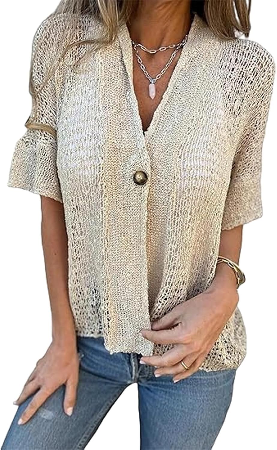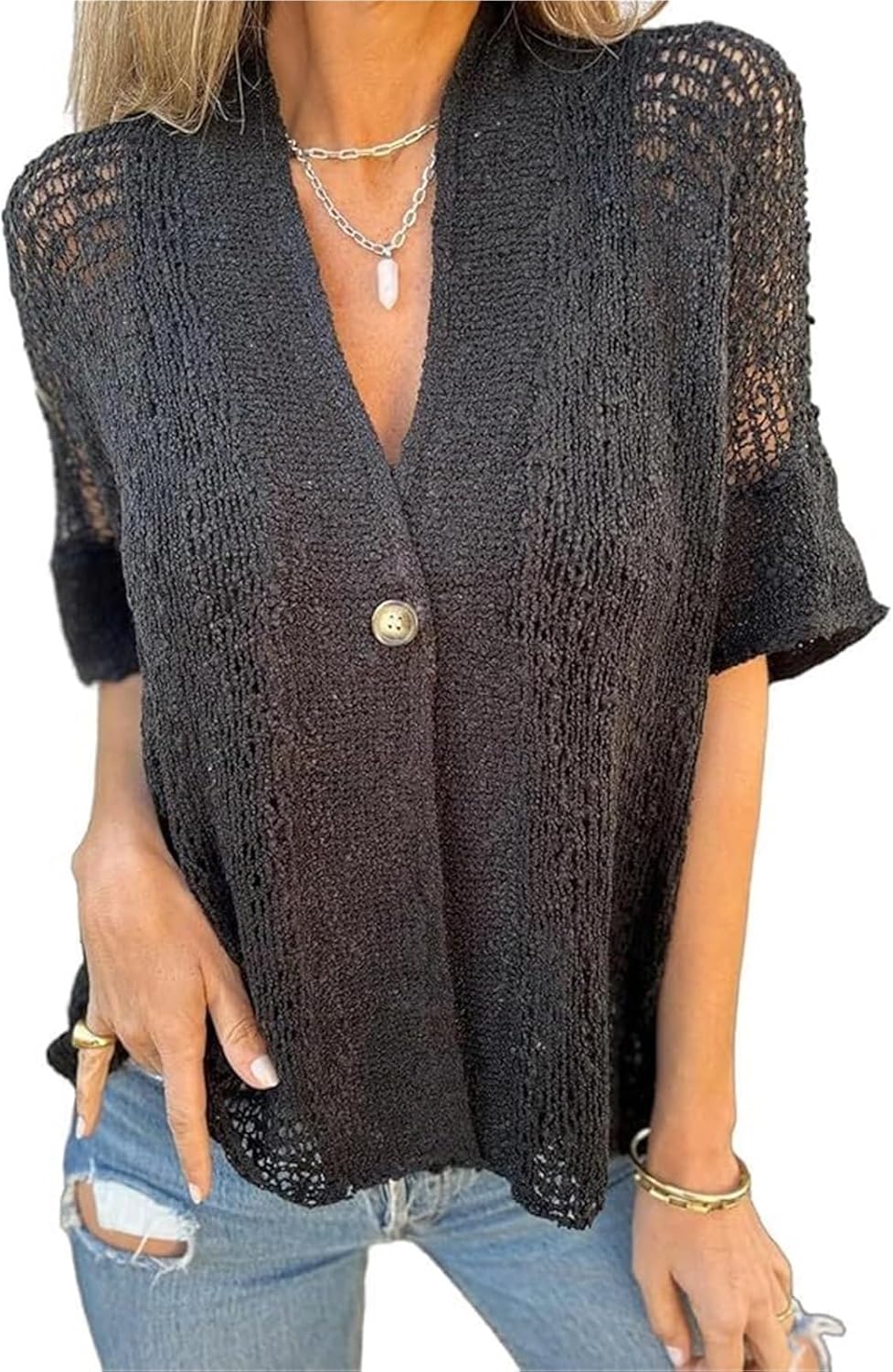 Features:1. Cooling Crochet Weave: The Hollow V-Neck Single Button Loose Short Sleeves enhances airflow for summer comfort2. Effortless Layering: Loose fit perfect for covering up at the beach3. Soft & Lightweight: Gentle on skin, ideal for hot climates4. Travel-Friendly: Compact and wrinkle-resistant5. Feminine V-Neck: Adds a stylish touch to any outfitSpecifications:Name: Hollow V-Neck Single Button Loose Short SleevesSize: S, M, L, XL, 2XL, 3XLWeight: 220 gPackage Included:Hollow V-Neck Single Button Loose Short Sleeves