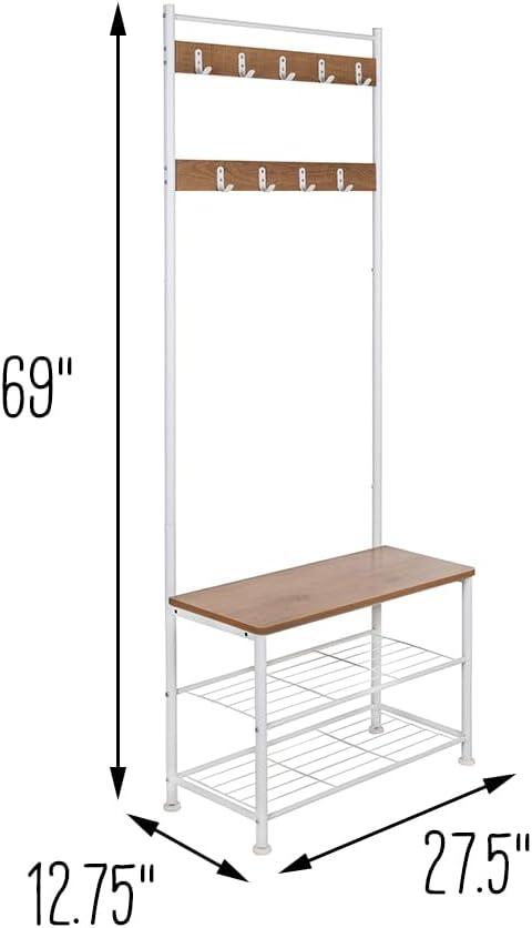 This modern entryway hall tree is ready to impress with its combination of beauty and flair for organization. It features a double row of nine hooks that will hold everything from your outdoor wear to the kids' backpacks. Heading out the door? Slipping on your shoes has never been easier with the spacious wooden bench with metal shelves nestled underneath to hold your shoes within reach. On top of its practicality, the incredibly sleek silhouette of this coat rack bench melds beautifully with everything from farmhouse to transitional décor. It is a welcome addition to any entrance, foyer, living room, hallway or mudroom