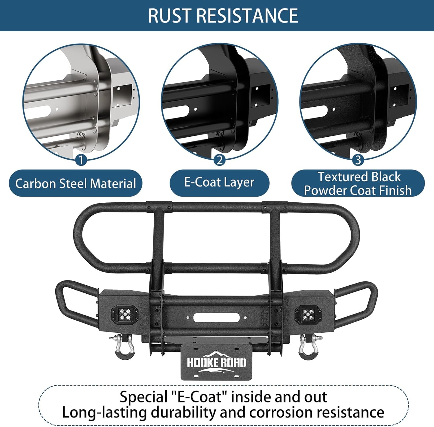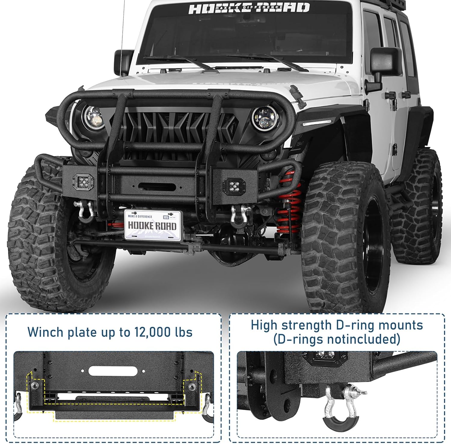 | Included Components | Installation Instruction, JK Front Bumper Assembly, License Plate Mount, Mounting Hardware Kit, Winch Plate, 2× LED Spotlights, 2× D-Rings |