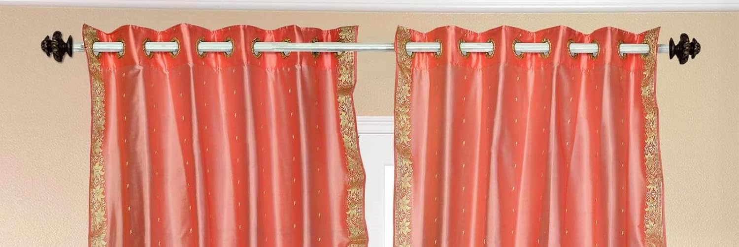 Ring-top drapery is sophisticated and contemporary. Ring-tops have decorative rings attached to the drapes. Rings create a pleated look that is crisp and modern.Sari Curtains / Drapes / Panels are the perfect choice for those looking for light, elegant drapes with a touch of luxury. It has smooth finish with a soft sheen and feels gentle and cool to the touch. Sheer curtains made of saris allow light in through windows but prevent people looking in when they are drawn. Story Behind the Art: The fabric of these curtains are weaved on a hand-loom in a small rural village in India and then hand-dyed. The artisans are a group of young hand-crafters who have moved from small villages to a big town in Central India and make various home decor items out of these exotic sari fabrics. This gives these wonderful artisans a way to have sustainable income via selling to the worldwide market on the internet. Your purchase supports local and home-based work where the artisans can easily tend to their families and pass these time-honoPeach pink skills from one generation to the next.