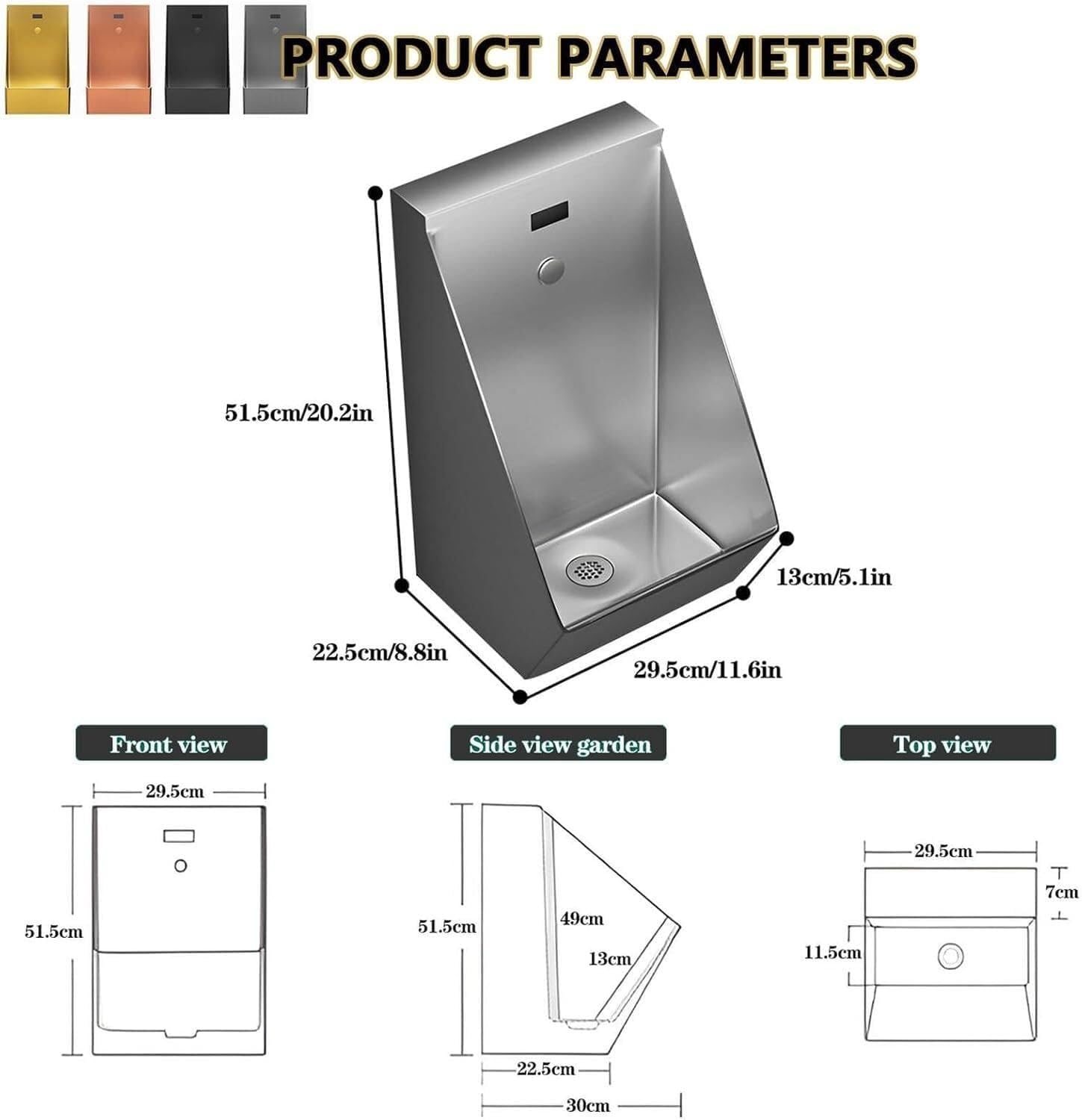 Features:1. Urinal is made of 304 stainless steel, no deformation, scratch resistance2. Automatic induction flushing, easy to use3. New upgraded deodorant device, strong deodorant ability, say goodbye to odor4. Deepen the inner tank design, say goodbye to splashing5. Multi-layer brushed, anti-fingerprint coating, no fingerprints, clean as before6. Invisible water outlet design, large flushing area, reduce splashing, avoid clogging7. Wall-mounted design, no space8. Exquisite appearance, suitable for various home stylesSpecifications:Product name: men's stainless steel wall-mounted urinalMaterial: 304 stainless steelSensing distance: 30-80cm automatic adjustmenttreatment: brushed processMaterial plate thickness: 1.2MMInstallation method: wall-mountedFlushing method: Automatic flushingApplicable scenarios: bathroom, bar, hotel, apartment, shopping mallPacking list:1 * Urinal1 * Installation accessories