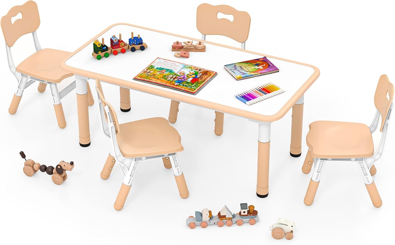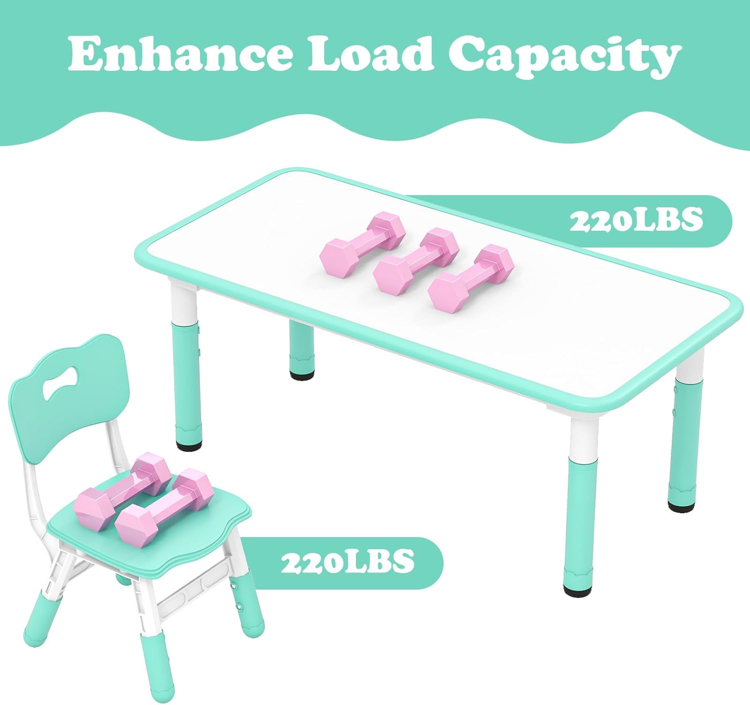 Why do you choose INFANS Wooden Kids' Art Table and Chair Set?Designed with growing kids in mind, our adjustable toddler art desk and chair set is the perfect solution for a variety of activities. The kids-sized table and chair set offers seven height settings, ranging from 18.9 inches to 23.6 inches, while the chairs come with three different height options (10.2", 11", and 11.8"). Crafted from high-quality, BPA-free PP material, this set is not only safe and odorless but also waterproof, wear-resistant, and smooth to the touch, enhancing its durability. The remarkable weight capacity of 220lbs for both the art desk and chair set provides unparalleled stability. Additionally, the unique 47" x 23.5" graffiti-style tabletop encourages creative expression, as children can use watercolor pens to doodle and draw. Cleaning is a breeze, as the surface can be easily wiped down with a cloth. This versatile set offers ample room for a variety of activities, from homework and arts and crafts to playtime with friends. Invest in a furniture solution that grows with your child and supports their development.Features:Certified by ASTM and CPSIASuitable for children aged 18+ months oldEasy to assemble with instruction and hardwareSuitable for learning, drawing, doing crafts, etcSmooth rounded corners provide better protectionSpace-saving design with stackable chairs for convenient storage7-position adjustable table and 3-position adjustable chairs for various needsSuitable for the kids’ room, kindergarten, day-care center and moreSpecifications:Color: Green/Natural/PinkMaterials: PP, Engineered WoodDimension of Table: 47" x 23.5" x 18.9"-23.6" (L x W x H)Dimension of Each Chair: 12.5" x 14" x 20"-21.6" (L x W x H)Size of Seat: 12.5" x 12" (W x D)Seat Height Range: 10.2"/11”/11.8"Net Weight of Table: 25.5 lbsNet Weight of Each Chair: 3.5 lbsWeight Capacity of Table: 220 lbsWeight Capacity of Each Chair: 220 lbsRecommended Ages: 18+ Months OldPackage Includes:1 x Table4 x Chairs1 x Instruction