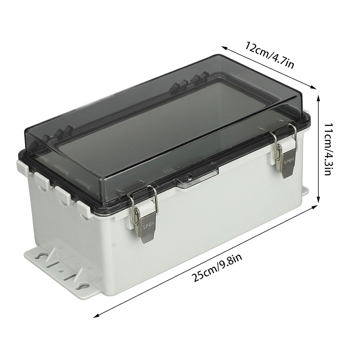 Circuit BreakersItem Type: Waterproof Outdoor Project Junction BoxMaterial: ABS, 304 stainless steelWaterproof Level: IP66Size: Approx. 25 x 12 x 11cm / 9.8 x 4.7 x 4.3inPackage List:1 x Waterproof Junction Box4 x Mounting Pads4 x ScrewsMaterial : PP