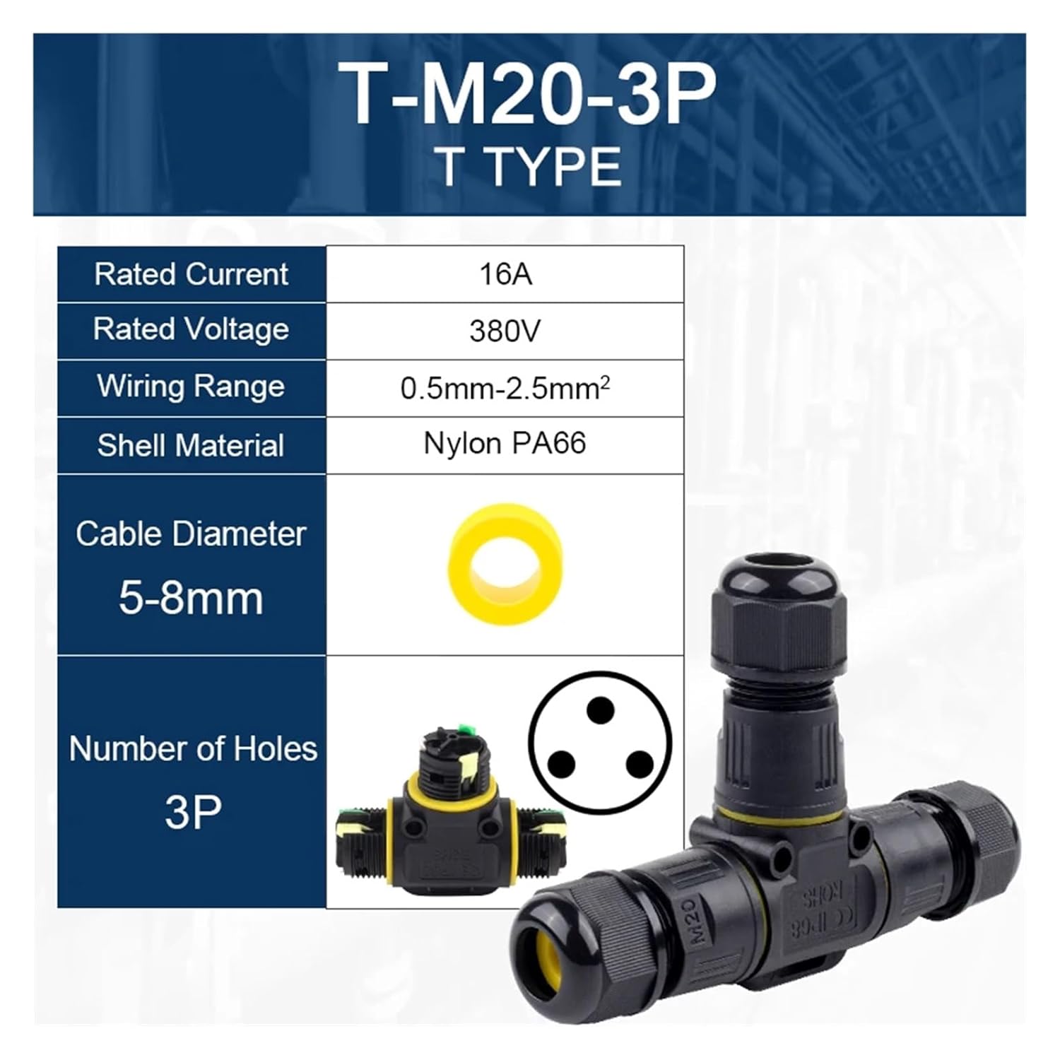 ConnectorsModel Number : IP68 T type waterproof ConnectorVoltage : 380VOrigin : Mainland Certification : CERated Voltage : 400VCore : 2P/3PCable Range : 5-8mm/9-12mmWiring Range : 0.5-2.5mm²Terminal Material : Purple CopperShell Material : Nylon PA66