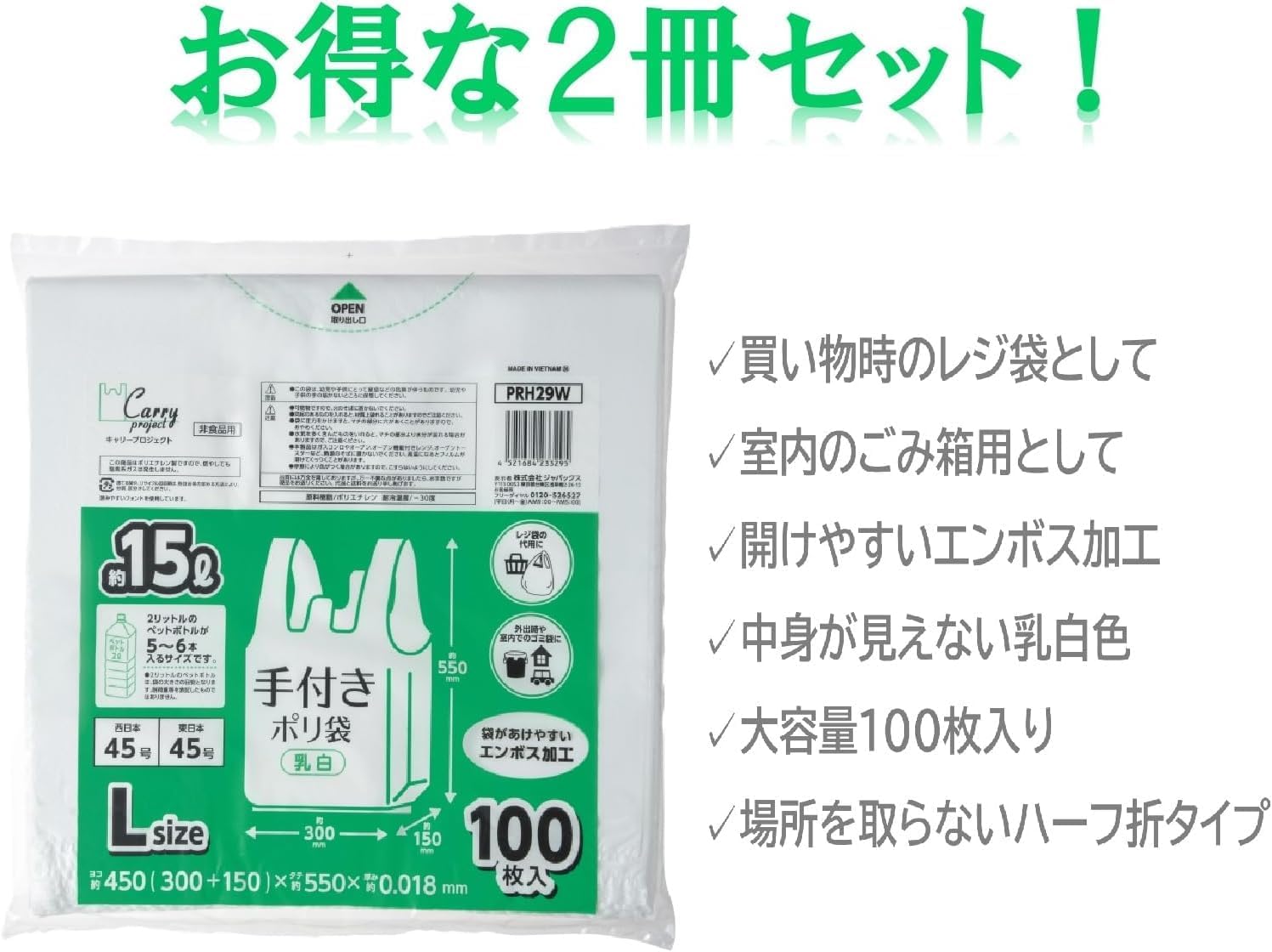Compact and convenient for storage than regular 100 plastic grocery bags Includes 100 sheets for plenty of use. Milky white type makes it hard to see the contents inside. Shakashaka-type cash register bag. Recommended as a replacement for grocery grocery grocery bags, as well as for outdoor garbage bags, and indoor trash bags. Standard 100-sheet package ratio for additional storage Milky white with the original baggage and useable foreign diseases to be welcomed. This bag is available as a replacement for super city bags, and is suitable for going out and indoor use. Warning: ● This bag may present choking hazards to infants and children. Keep out of reach of infants and children. This is a flammable product, so please do not place it near fire. Please be aware that if you insert objects with protrusions may cause them to break. ● Please do not rub as the color of the garment may cause friction. ● Non-tactile and childhood choking and other dangerous as the product is left in the shogo product. Easy to flammable products, of course, near open fire sources. ● Pointed Product Factor: Material: There is a chance of bursting. Can be worn with friction, or as a matching outfit.