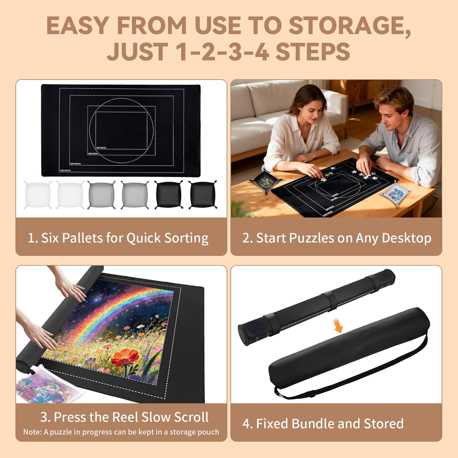 | Included Components | 4 Transparent puzzle storage bag, 6 Puzzle Sorting Trays, Jigsaw Puzzle Mat Roll Up, Travel Storage Bag |