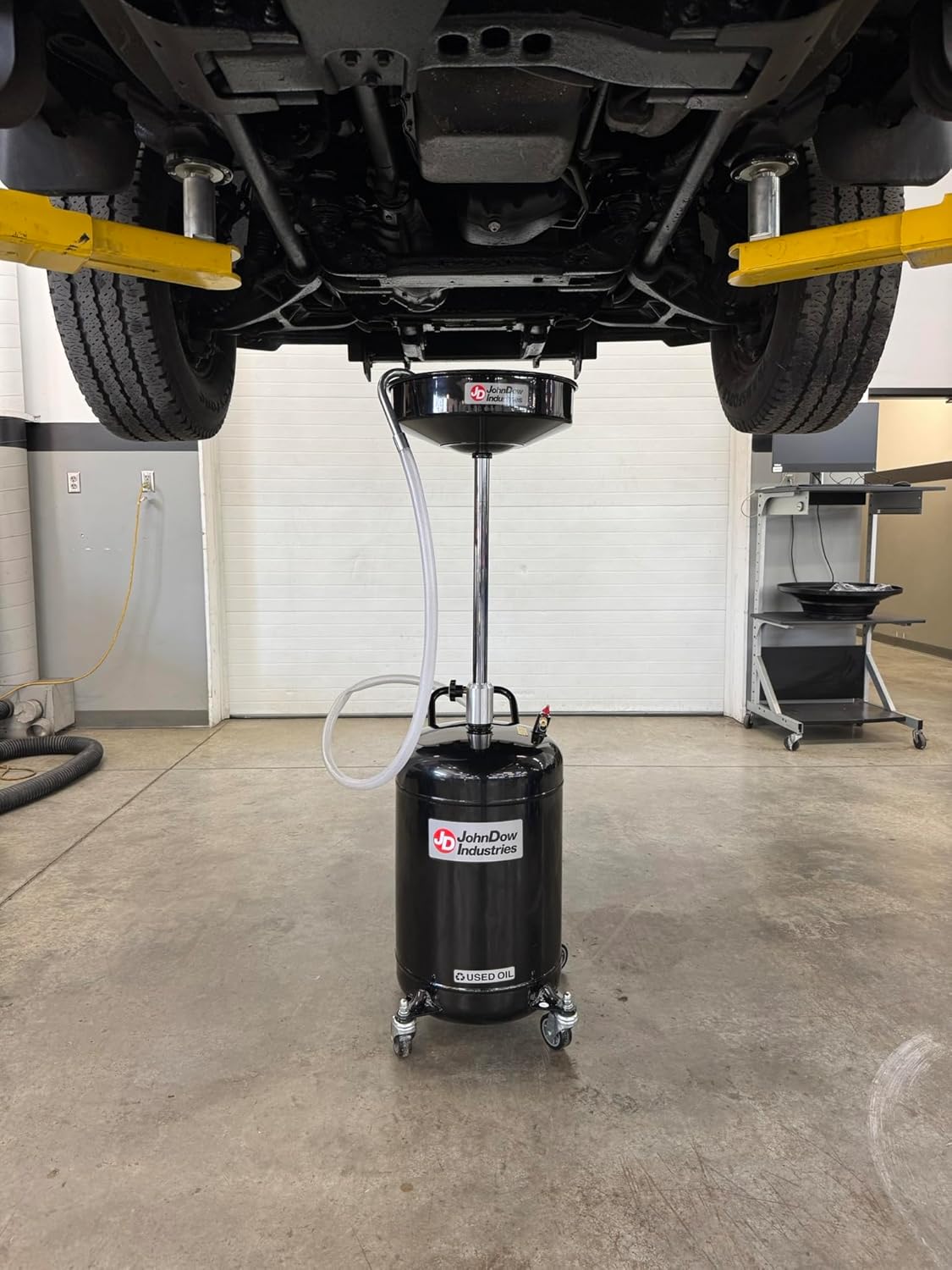 The JohnDow Industries JDI-18DC 18-Gallon Self-Evacuating Portable Oil Drain is engineered for high-volume automotive service environments that demand speed, cleanliness, and durability. Designed specifically for professional repair shops, dealerships, fleet maintenance facilities, quick lube centers, and municipal service departments, this heavy-duty fluid management system streamlines used oil collection and evacuation. The integrated Auto-Check Technology eliminates manual pumping, allowing technicians to transfer fluids quickly and efficiently into bulk storage tanks — reducing downtime and improving bay productivity. The 18-gallon welded steel reservoir is built to withstand daily commercial operation, while the 16-inch metal funnel captures high-flow oil changes with minimal splash or overflow. A telescoping height range of 36 to 59 inches allows easy positioning under vehicles on lifts, making it ideal for servicing passenger vehicles, light trucks, and commercial fleets. Four chemical-resistant swivel casters provide smooth mobility across shop floors, and the 6-foot discharge hose enables direct, controlled transfer to waste oil storage systems. The result is a cleaner workspace, safer fluid handling, and faster turnaround between jobs. For operations that prioritize efficiency, technician productivity, and professional-grade equipment, the JDI-18DC delivers reliable performance built for real-world shop conditions.