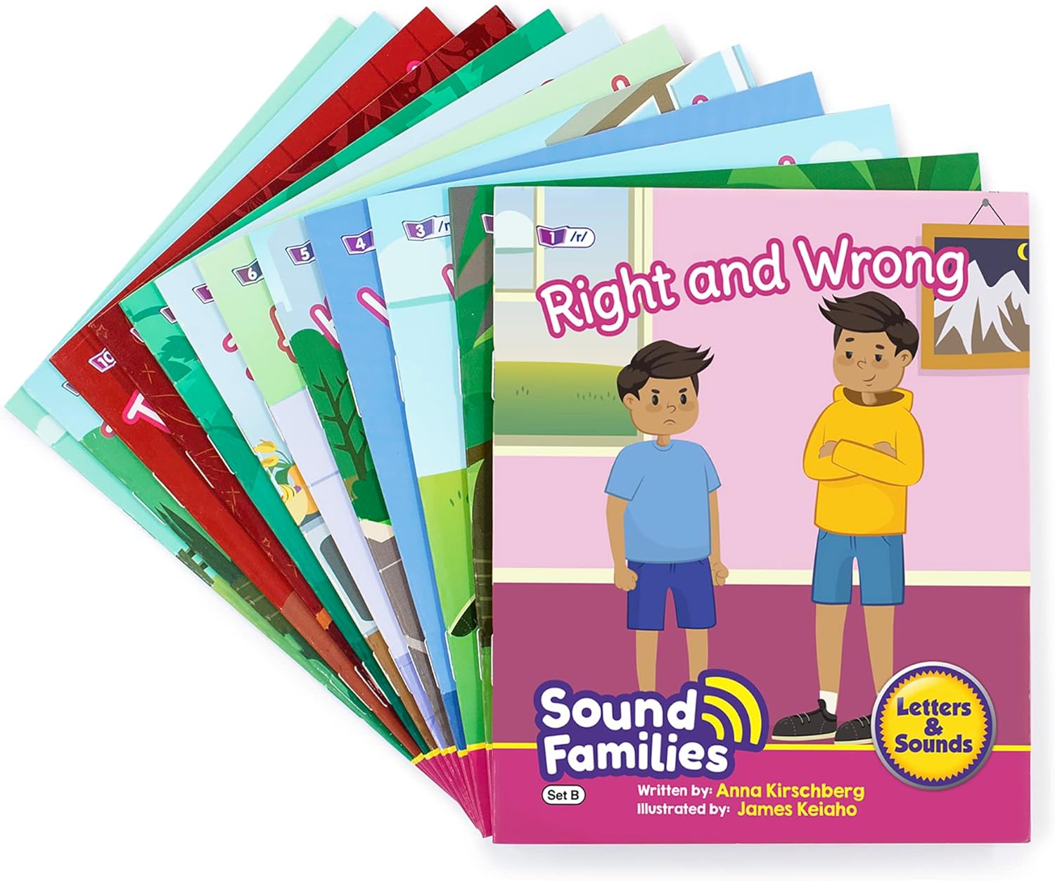 This set of fiction Sound Families decodable readers covers consonants and short vowels (/r/ /n/ /m/ /ch/ /k/ /sh/ /j/ /v/ /u/ /e/ /i/ /s/ /zh/ /z/). There is one title for each sound. Within each reader, alternative spellings are provided (graphemes) for the target sound (phoneme). Children can identify the target sound in the text quickly as they have been highlighted and then compare the spelling across the sound family. Other words included are decodable at the phase level as well as common exception words in accordance to the progression. The set includes 12 fiction readers, each with colorful illustrations. For ages 5+, Grade 1,, Book Band: Turquoise (Fluency 2), Guided Reading Level: J, Reading Level: 18.