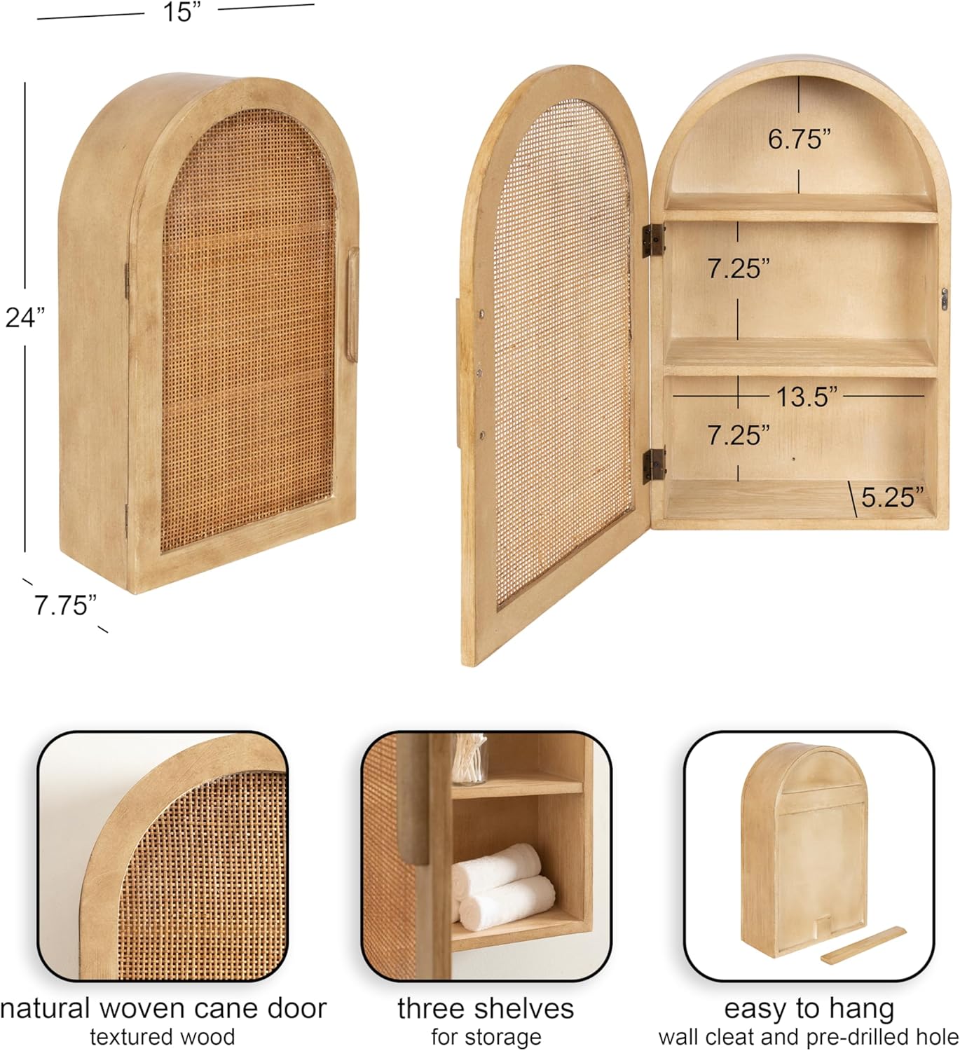 Transform your home into a comforting modern space with the transitional Ori arched wall cabinet. This lovely wall-mounted cupboard features a cane facing and three shelves within a wooden frame. This rattan detailing provides your space with a light accent that can lean boho or coastal, based on the overall vibe of your space. The arch cabinet is crafted from wood veneer, resilient wooden material, and rattan facing. The rattan-faced door gives way to loads of storage space for your bathroom toiletries or your living room decor accents. Or, use it in your kitchen for a bit more storage for spices or pantry items. The overall dimensions of this charming storage cabinet are 15 inches wide by 7.75 inches deep by 24 inches tall. This gives you plenty of room to use this lovely piece as bathroom decor and storage, a decorative display case for family treasures, or a particularly natural media cabinet in the living room. Use the wood cleat hanger to allow for quick and easy installation in minutes.