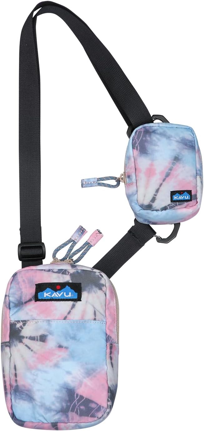 2 n 1, modular "wear your way" cross body pouches connected with an adjustable webbing shoulder strap that can detach and can convert to belt bag, plastic tri slide and carabineer hardware, small pouch with zip closure, large pouch with main compartment zip closure, one front slip pocket and one internal zip pocket, rope loop zip pulls and pattern webbing details