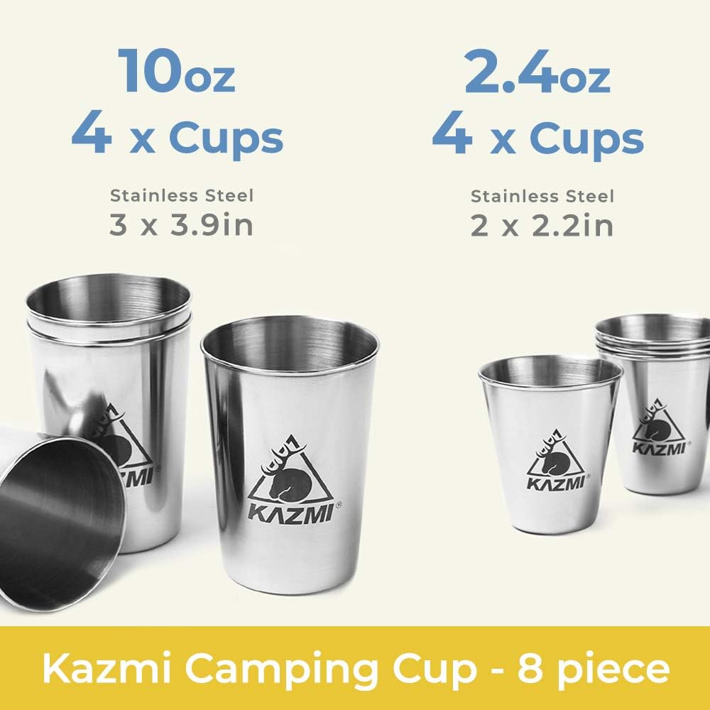 Kazmi Stainless Steel Cups - 8 Set | Large and Small Size | Stainless Steel Tumbler and Metal Drinking Glasses Set for Camping, Hiking, Backpacking, | Water, Coffee, Wine, Beer | BPA Free