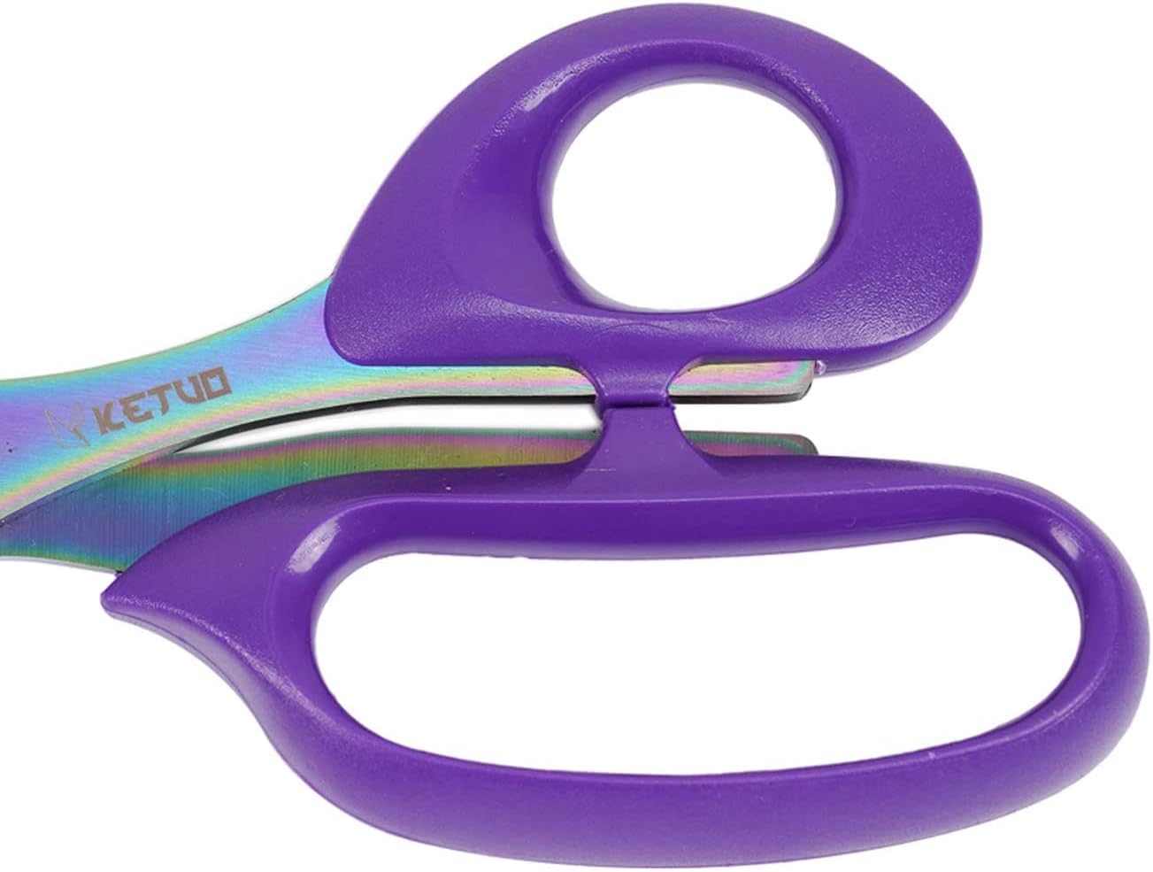 Item Specification: Size: 10 Inch x 3.5 Inch Color: Purple grip & Multi-color titanium coating blades Material: Stainless Steel Features: ULTRA SHARP COMFORTABLE USE PROFESSIONAL DESIGN ALL PURPOSE USE SCISSORS
