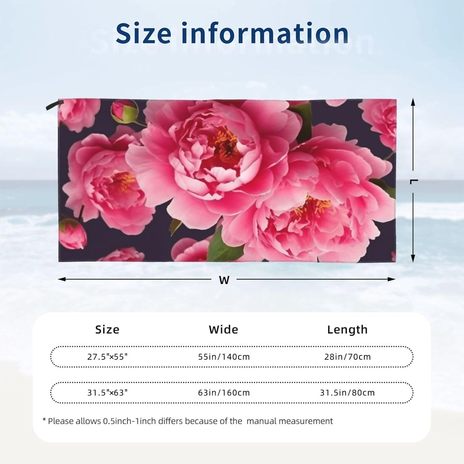 designPeony flowers compact towel for camping are designed with one-sided printing. The towels are equipped with special packaging bags and carabiners, which are convenient for packaging and hanging, and can be hung anywhere to dry quicklymaterialcompact towels for swimming is made of microfiber, which is more absorbent than standard towels, dries quickly, is lightweight, and small enough to easily fit the towel into a gym bag or backpackscene cotton towel for beach carabiner on the bag, can be attached or packed into your bag, the beach towel can also be used as a sports towel, travel towel, yoga towel or used as a beach, bathing, swimming pool, swimming, boating, sunbathing, mats for spa, sauna, water park, climbing, fitness, yoga, travel, camping, hiking, picnic, travel, outdoor and sports, etccomponentbeach blanket for swimming have buckle webbing, easy to hang and air dry, pvc packaging bag, equipped with a carabiner, easy to store and carrywashinglightweight towel for swimming machine washable, wash before first use, just hand wash or machine wash, air dry