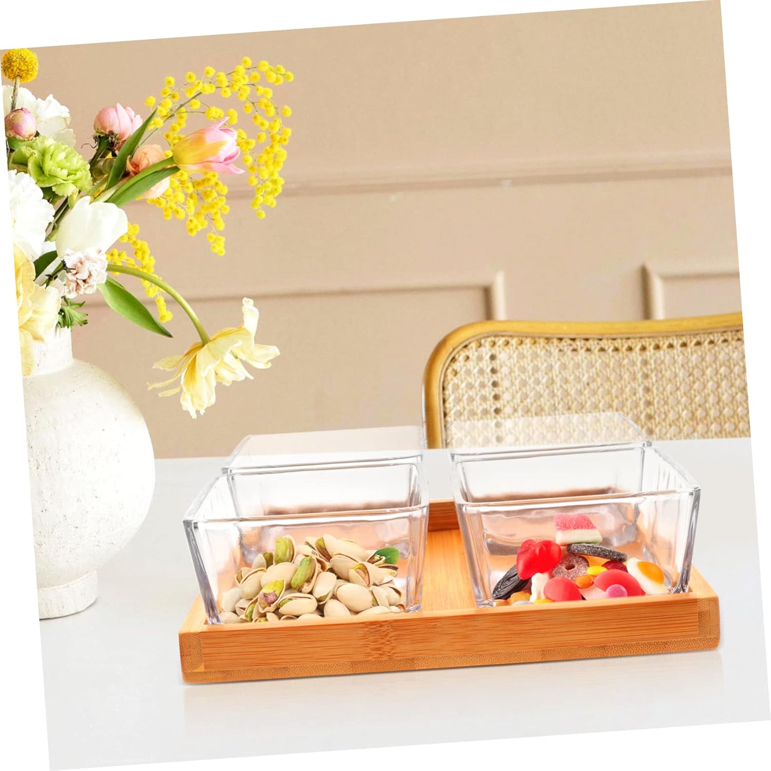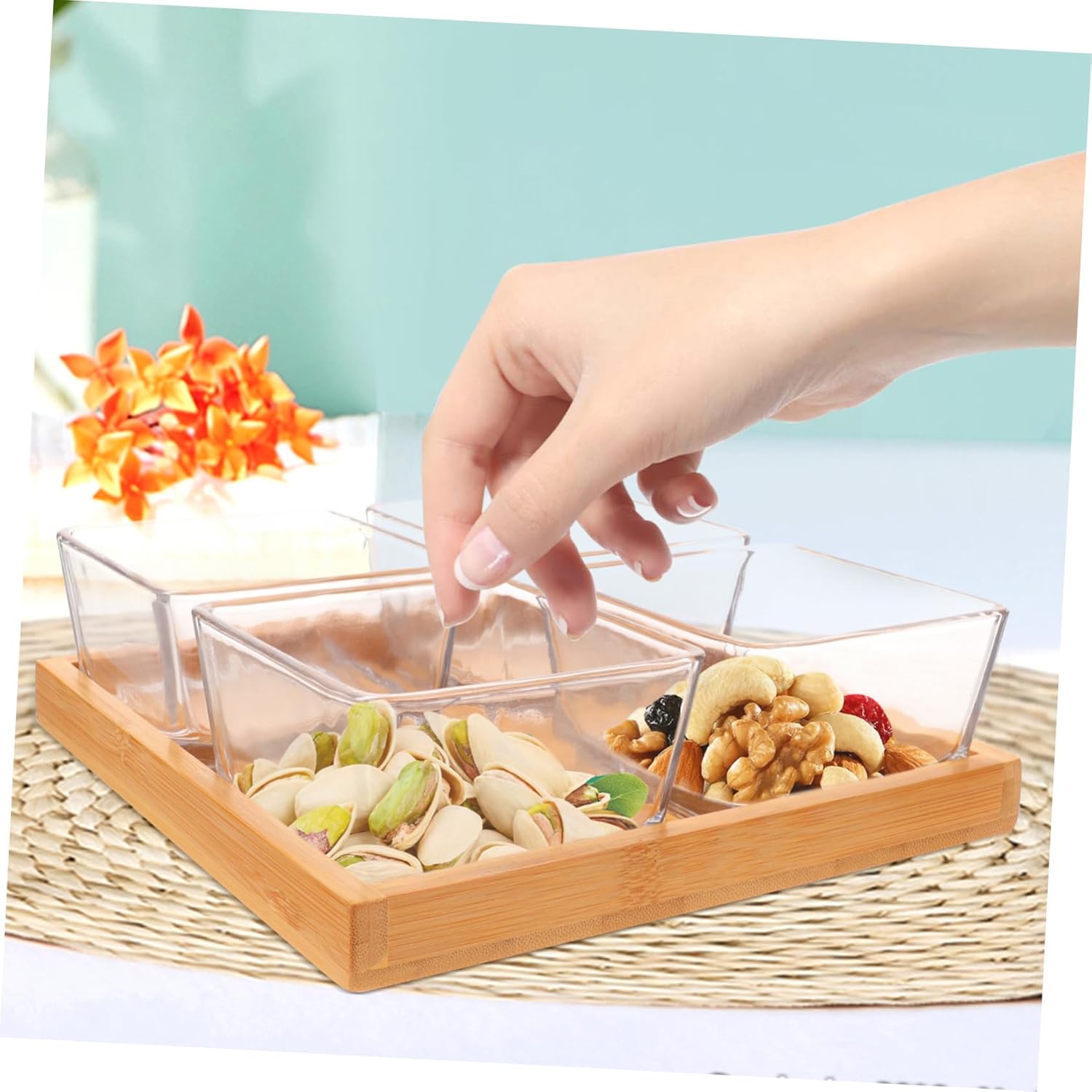 Package Include 1 4 x bowls Characteristics -Material: , glass snacks dish with tray - Size: 19.50X19.50X6.00cm/7.66X7.66X2.36in desktop serving dish - Not easy to fade, whether it's indoors or out, formal dinners, casual brunches or family meals, it can offer you better service home food container. - Made from material, this snacks plate is ideal for candies, dried fruit is sturdy and , can be used long period snacks - It can also be taken out separately as a dip bowl. for seasonings and condiments decorative - Reasonable structure design, this multi-function dried fruit plate is both and fashionable for your home use snack tray. - Sufficient capacity, fit for sharing dried fruit and snacks with guests in leisure time or in all kinds of parties small - ColorTransparent home snack trayGoods Information tray Snacks plate is also great as a serving platter for bread pastries and a container for other dry goodies.small plate for all of household storage use from the kitchen to and more.snack dish Modern style, very nice-looking, can store candies, snack, nuts, and many other food, satisfy your requirements better