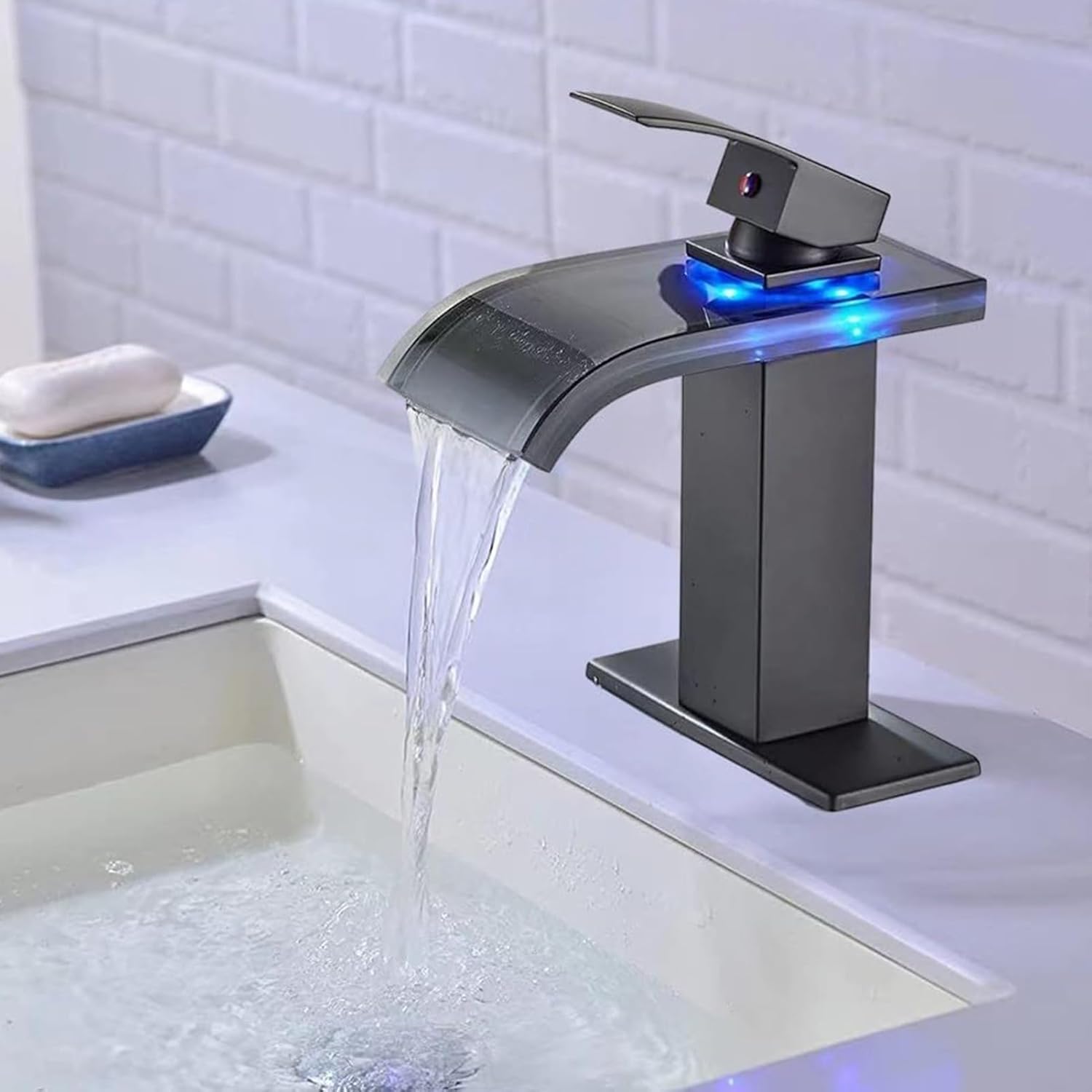 ❣【Black Kitchen Sink Features:No Scalding RiskThe colors of the LED light Faucet change on the water temperature: ①Blue-cold water(0~30°C); ②Green-warm water(31~42°C), ③Red-hot water(43~52 °C) ④ Extremely hot water-Red light flashes on, No further battery or needed.Protect you and your family and children from hot water.High - QualityBathroom faucets are made of high-quality brass. The chrome is clean, smooth, easy to clean, and resistant to rust and in everyday use. Glass Spoutmakes is easier to clean and will not rustFaucet Light Waterfall SpoutThe design of Waterfall Glass Spout makes Vanity faucet comtemporary Modern fashion, make the whole bathroom space become elegant and not lose luxury bring more fun and vitality to your bathroom life,❣【Bathroom Faucets Specifications:Product Name: Faucet/kitchen sink faucet/Mixer Tap SingleMaterial: copperSize:25*15*5cmColor:black❣【Package Content:1pcs x Faucet2pcs x Hoses