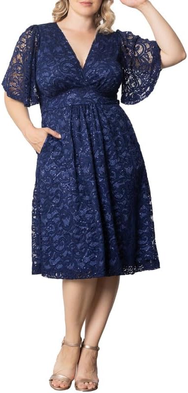 You'll dazzle the eyes at your next soiree in our Starry Sequin Lace Cocktail Dress. Featuring a flattering surplice neckline, flutter sleeves, and a gentle A-line silhouette, this sparkly plus size cocktail dress even has a surprise element...pockets! Perfect for that best dressed wedding guest or any special occasion from cocktail party to formal gala, this timeless plus size sequin dress is available in classic black and beautiful seasonal colors. This plus size party dress comes exclusively in sizes (0x,1x,2x,3x,4x,5x, 12,14,16,18,20,22,24,26,28,30 and 32).
