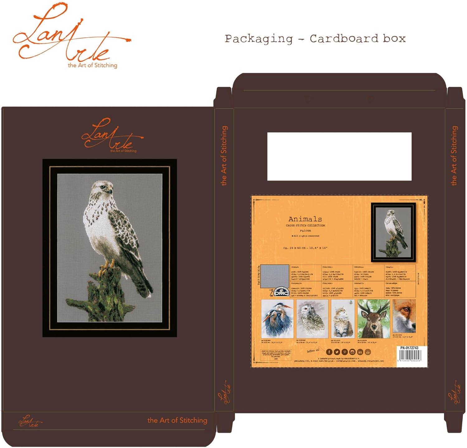 Lanarte Falcon Counted Cross Stitch Kit Finished size: 26 x 40 cm. Contents: Aida 14 dark grey; (100% cotton), DMC Mouline embroidery thread (100% cotton), counting scheme, needle, photo, instructions in 8 languages. Number of colours: 23. HAN: PN-0172743.