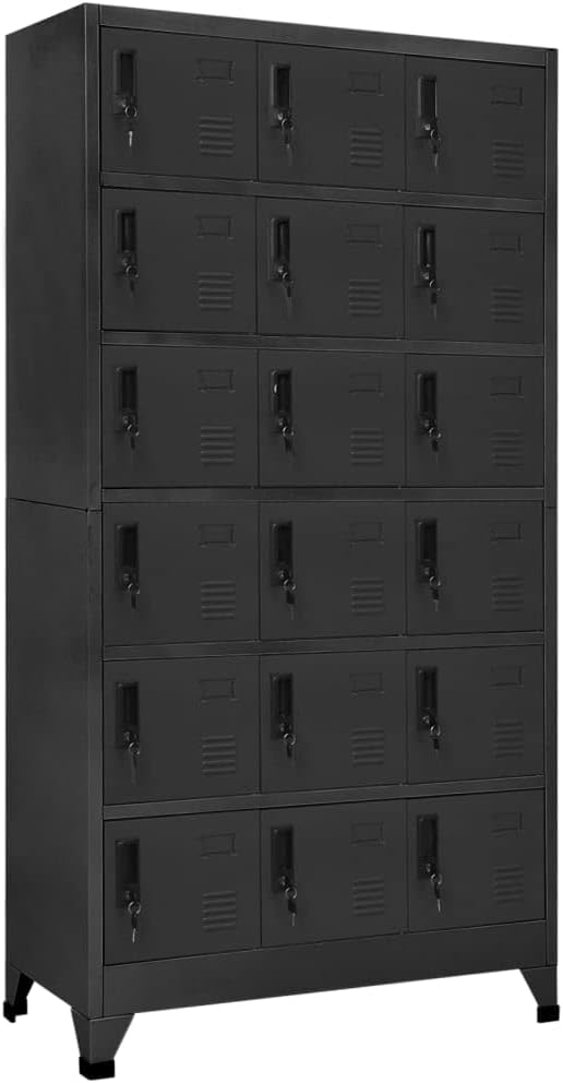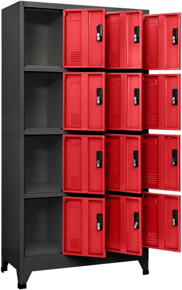 This large locker cabinet, designed in a modern style, perfectly combines function and looks. With its sleek anthracite and red finish, it offers an impressive storage solution while keeping your belongings secure and organized. Its sturdy steel construction ensures longevity and reliability, making it a must-have for your office or mudroom space, enhancing both your storage capabilities and the appearance of your environment.Ample Storage Capability: This cabinet features 12 spacious lockers, each with its own locking mechanism for excellent security. You can store anything from personal items to important documents without worrying about unauthorized access. This feature ensures that every user has a private storage space.Constructed from Steel: The steel material is resilient and easy to clean, allowing for effortless maintenance. Its powder-coated finish boosts the cabinet's durability against wear and tear, keeping its look and functionality intact for years. This durability is essential for busy environments like schools and offices.Stylish Aesthetic: The modern design, featuring anthracite gray with striking red accents, makes it a stylish addition to any contemporary decor. Its sleek look brings a touch of sophistication while providing utility. This isn't just a storage unit; it's a piece of furniture that enhances your space.Suitable for Various Settings: Perfect for offices, schools, and mudrooms, this cabinet meets a wide range of storage requirements. Whether you need secure space for students' belongings or an organized setup for office supplies, this locker accommodates it all. Its versatility makes it a valuable asset in many places.Size and Dimensions: Measuring 35.4 in wide, 17.7 in deep, and 70.9 in high, this locker fits comfortably in any space without taking up too much area. Its tall design offers ample vertical storage, making it perfect for smaller rooms where floor space is at a premium.