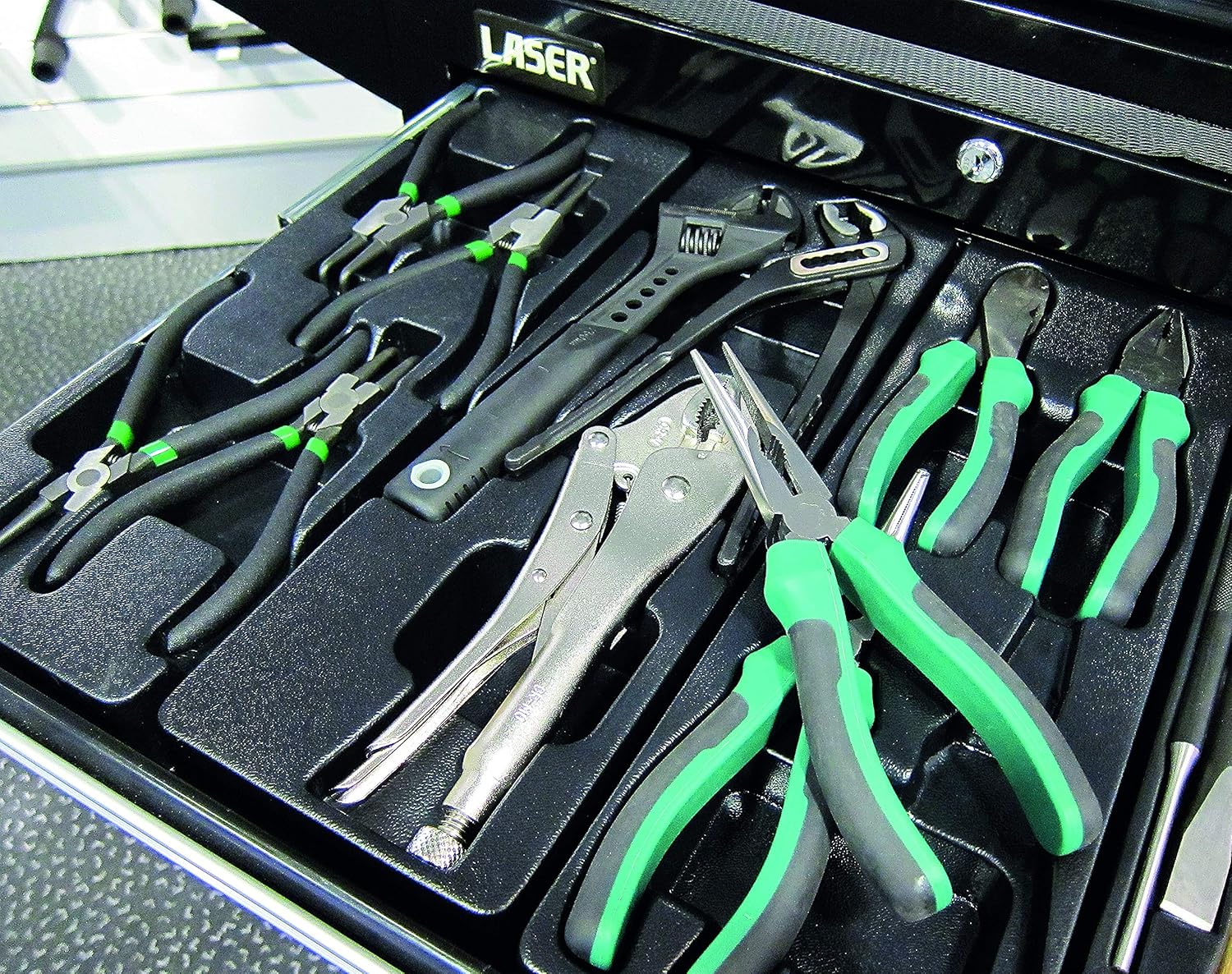Set of three high quality pliers and grips (water pump pliers, grip wrench and adjustable wrench in moulded tool control tray, perfect for storing in tool chests or on workshop surfaces. A British tool company based in Warwickshire, United Kingdom. Laser Tools draws on years of experience to introduce quality products which offer real value for money. All our products are responsibly sourced both from trusted ethical partners across the world PLUS (uniquely as an automotive tool brand) our own manufacturing base in the UK. Combining our British manufacturing, our years of experience and vast expertise in the automotive sector helps us achieve our aim of bringing high quality tool solutions first to market and being No.1 choice for many professional mechanics.