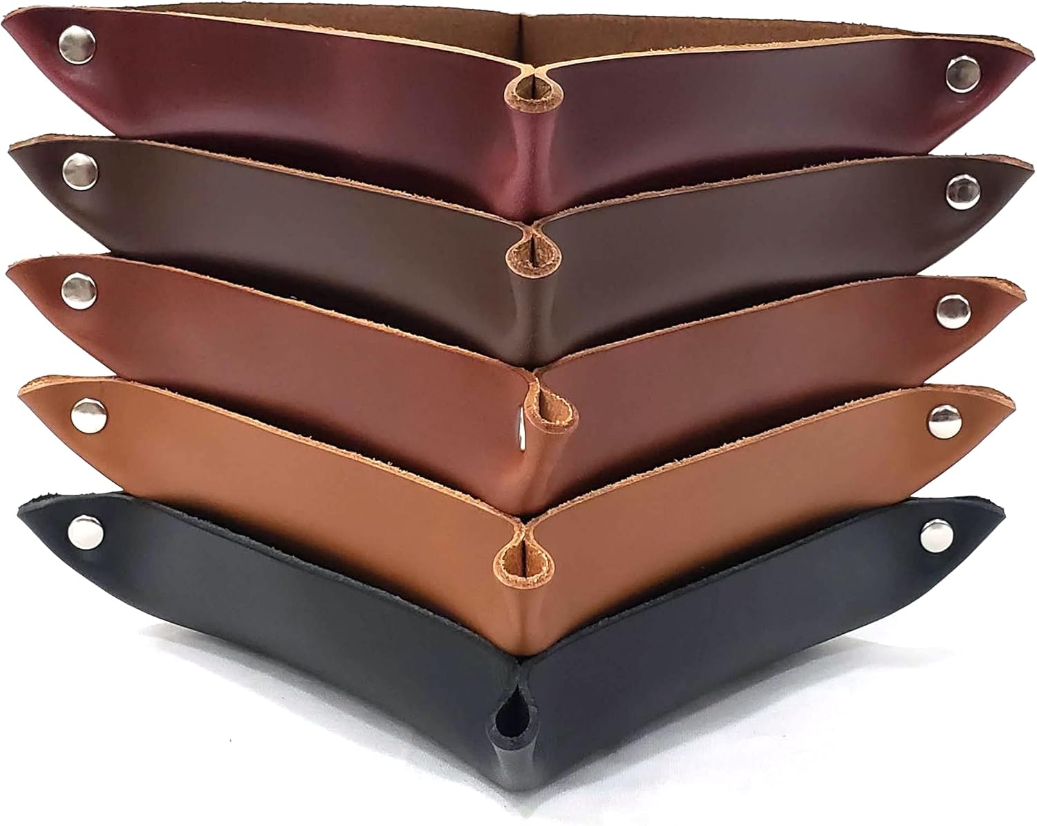 This leather valet tray is made from a beautiful finished 7 oz vegetable tan leather.Handmade in South Carolina USA. SIZE: 7.25” Square x 1.25” Tall Useable Space 6" square Sturdy and Quality Leather100% Genuine LeatherYou can use it as an organizer in: Office Desk Entree Way Night Stand Kitchen Counter Any Table Top