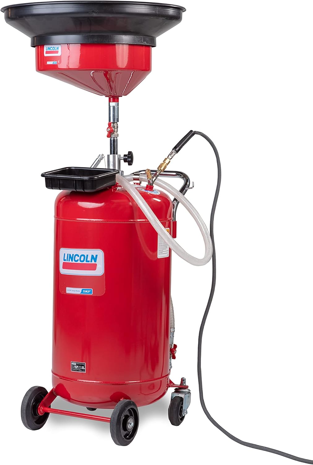 The Lincoln 3635 Pneumatic 25 Gallon Pressurized Fluid Drain and Evacuation Tank is designed for high-capacity fluid management in automotive, industrial, and commercial environments. Built with heavy-gauge steel for durability, this fluid drain efficiently handles used oil, coolant, and other fluids, making it essential for mechanics and fleet maintenance. it is 18" offset bowl features a metal filter screen for cleaner fluid collection, and the adjustable funnel height (51" to 76") accommodates various vehicles, from cars to heavy trucks. With 4" swivel casters for easy maneuverability and a pneumatic tank for rapid fluid evacuation, the Lincoln 3635 enhances productivity and efficiency in any setting, making it ideal for garages and workshops.