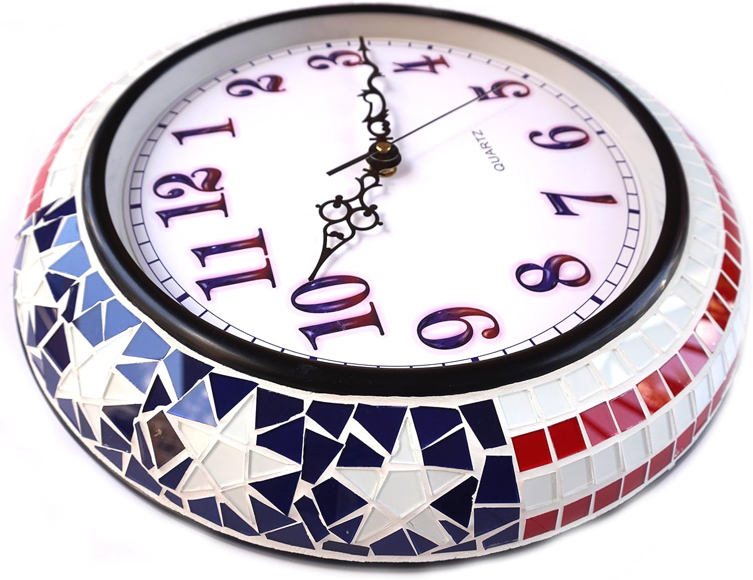 Lulu Decor, Beautiful handmade 15" US flag color mosaic wall clock with 10" arabic dial in co-ordianting colored numbers, clear and easy to read from a distance. Well made, durable quality wall clock, handcrafted by our skilled craftsmen. Silent high quality quartz suzuki brand japanese battery operated movement, made in china. Comes with protected glass cover on dial. Requires one AA battery (not included). Design of this wall clock will inspire partiotism, loyalty and devotion. Mosaic frame measures 15", dial measures 10". Perfect for Housewarming gift, holiday gift etc.