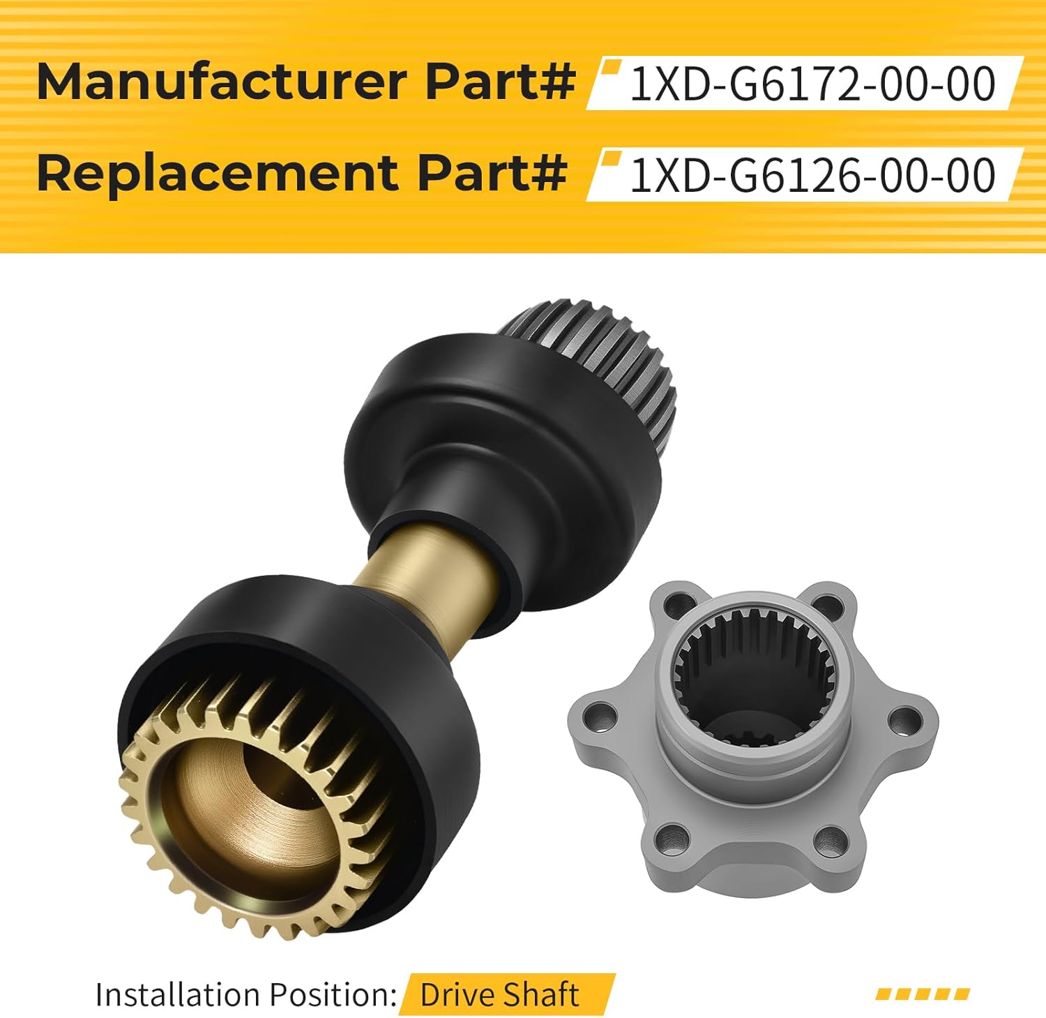 Manufacturer Part# 1XD-G6172-00-00 Replacement Part# 1XD-G6126-00-00 Installation position: Drive Shaft Package: Rear Drive Shaft Assembly x1 Rear Drive Shaft Differential Coupler x1 Fit for Yamaha UTV as follows V-iking 700 YXM700 2014-2024(All Edition) V-iking 700 F-I 4x4 YXM700 2014-2017 (All Edition) V-iking 700 VI YXM700 2015-2019 (All Edition) V-iking 700 VI EPS YXC700 2015-2024 (All Edition)