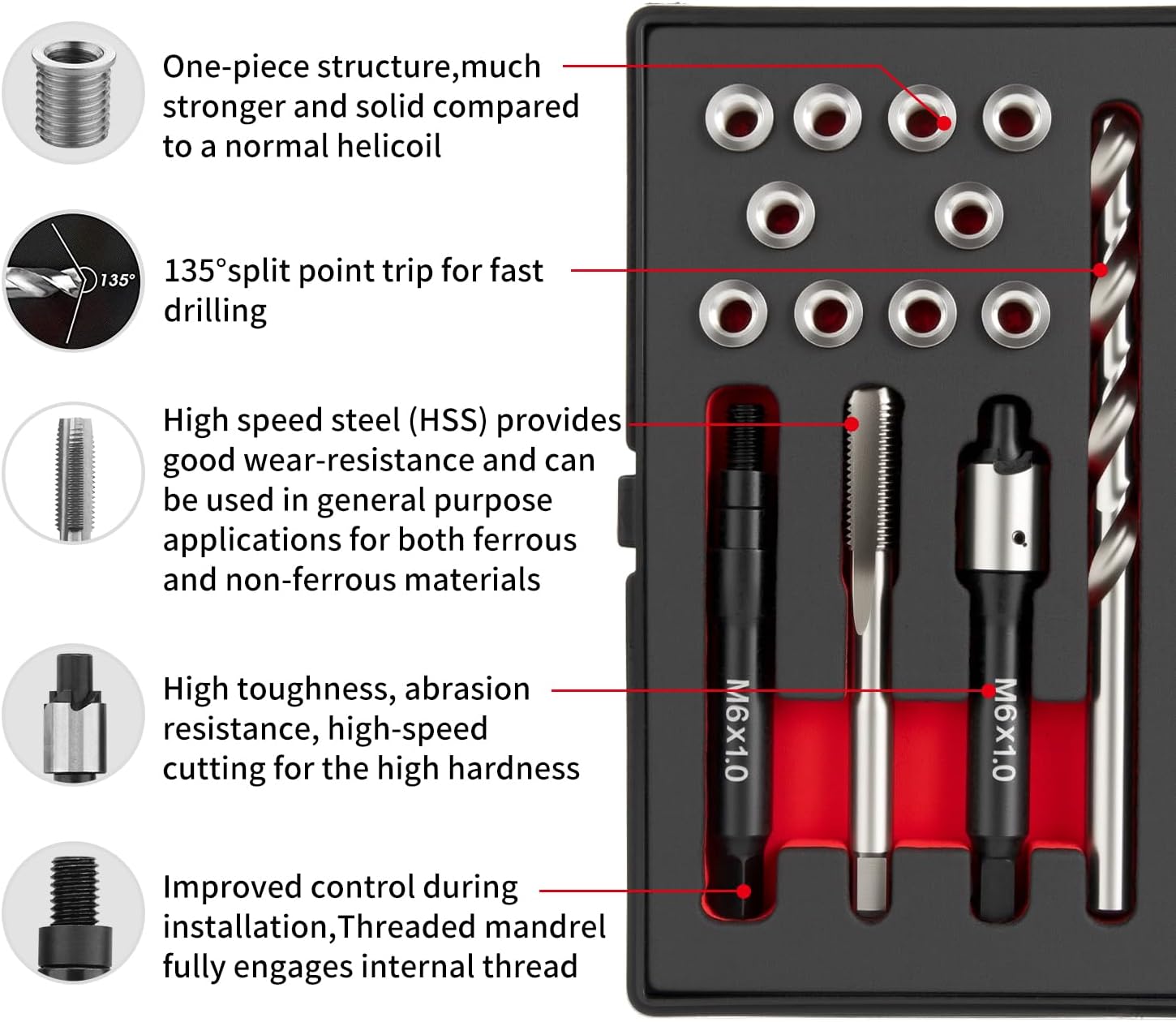 | Included Components | Drill, Tap, Install Driver, M6x1.0x9.4mm Inserts |