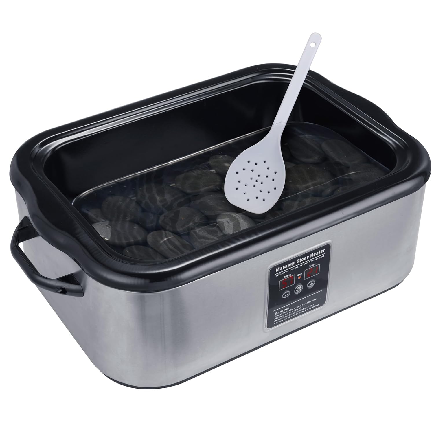 Elevate your massage therapy sessions with the Master Massage 18 Quart LED Hot Stone Warmer. Crafted from durable stainless steel, this professional-grade device combines reliability with elegance. Its intuitive digital display offers precise temperature control, reaching up to 70℃/160°F, ensuring optimal warmth for every massage.The spacious 18-quart capacity accommodates 100-120 massage stones, making it versatile for various therapeutic needs. A removable inner water reservoir simplifies water management, streamlining both setup and cleaning. Built with safety in mind, this warmer features an overheat protection system, automatic shut-off, and a cooling fan for long-lasting, worry-free operation.Operating the unit is effortless, thanks to its straightforward ON/OFF button and adjustable settings. Whether you're a seasoned therapist or new to hot stone therapy, this device delivers consistent, soothing heat for an exceptional massage experience. Designed for professionals, it’s the ultimate tool for creating a relaxing and effective therapy environment.