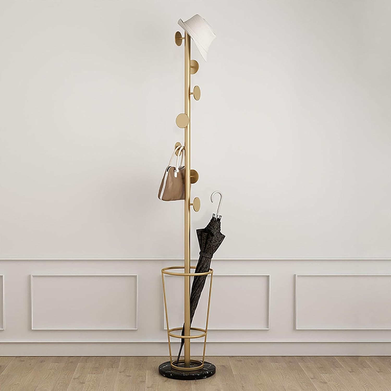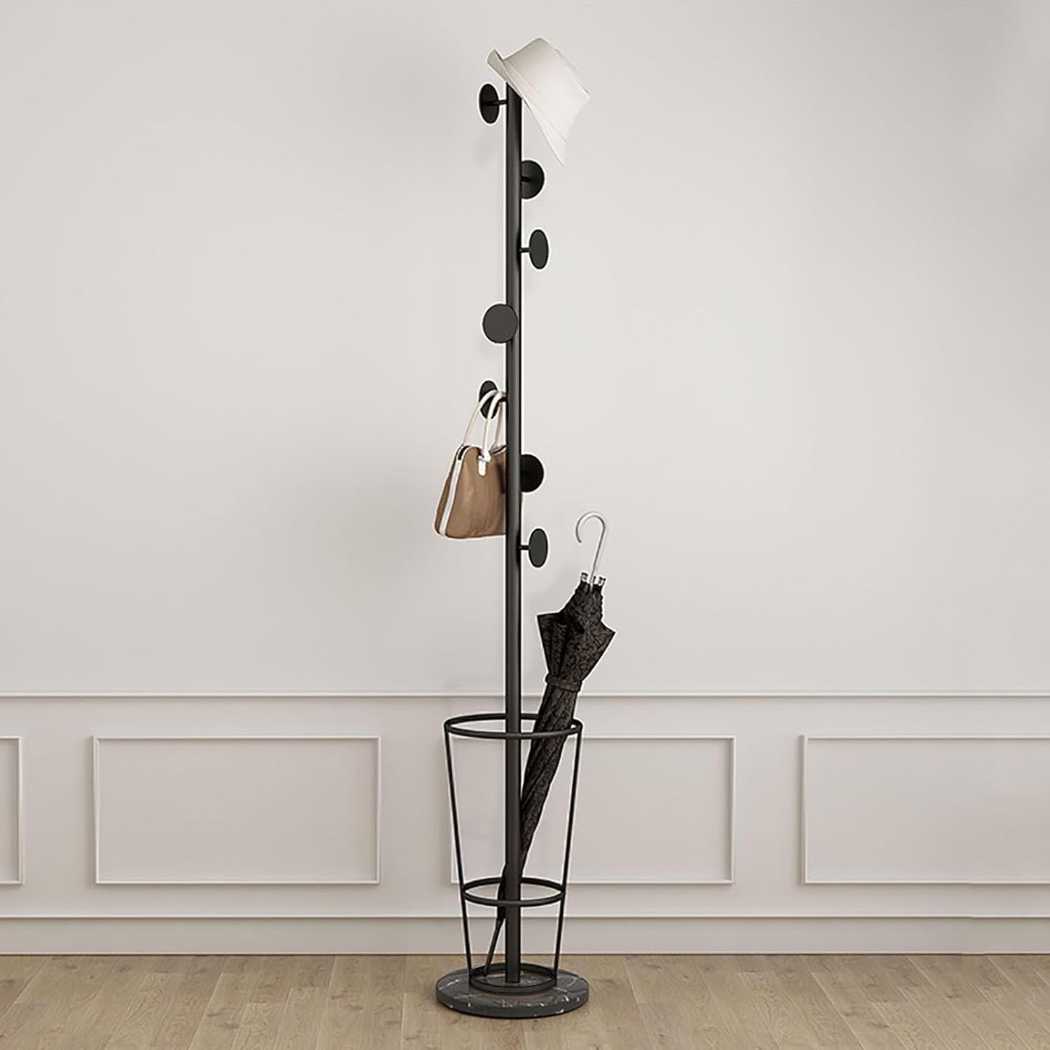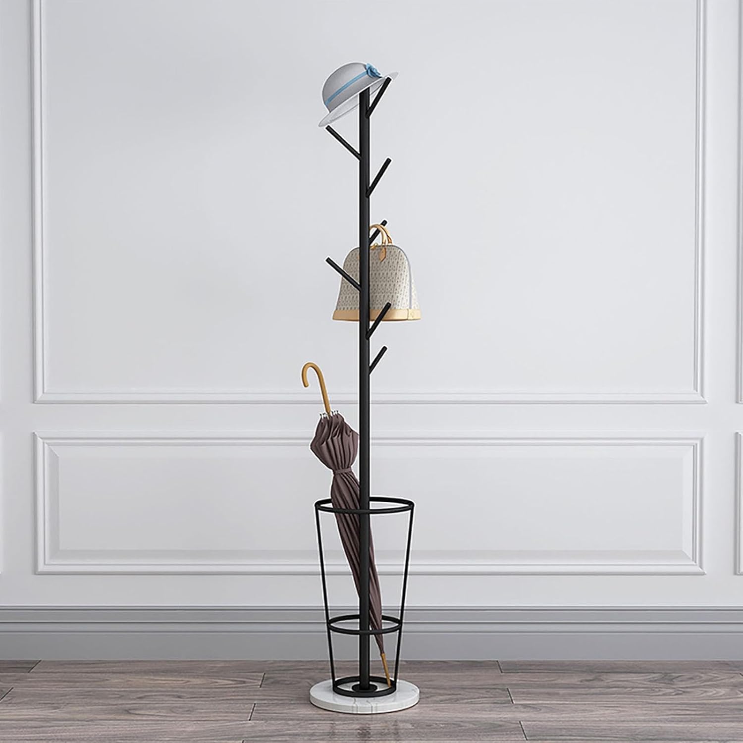 INDOOR UMBRELLA STAND WITH COAT RACKMaximize your entryway with our stylish indoor umbrella stand featuring a convenient coat rack. This multifunctional piece not only holds your umbrellas but also provides a dedicated space for your coats and hats, enhancing your organization and aesthetic. Perfect for homes, offices, or any setting where you want to keep things tidy and stylish.Key FeaturesINNOVATIVE MULTI-BRANCH DESIGN: The smooth, elegantly curved branches offer additional storage space for your hats, scarves, and bags, keeping your area clutter-free.45° OUTWARD INCLINED HANGING ROD: This thoughtful design ensures that hanging items remain separate, preventing tangles and allowing for a balanced distribution of weight, which enhances stability.OPTIMIZED UMBRELLA STORAGE: With a round base structure that promotes ventilation, your umbrellas will dry quickly, ready for use whenever you need them next.Specifications:Premium Metal Material: Crafted from high-quality iron with a durable marble base for stability.Color Options: Available in Black with a black base, Dark Brown with a black base, Black with a white base, and Dark Brown with a white base, allowing you to choose the perfect match for your decor.Hook Types: Features branch hooks (A) and round cake hooks (D) for versatile hanging options.Dimensions: 33×33×170cm (13×13×66.93in), ideal for any indoor space.Package Includes: 1 umbrella stand with coat rack, ready to enhance your organization.