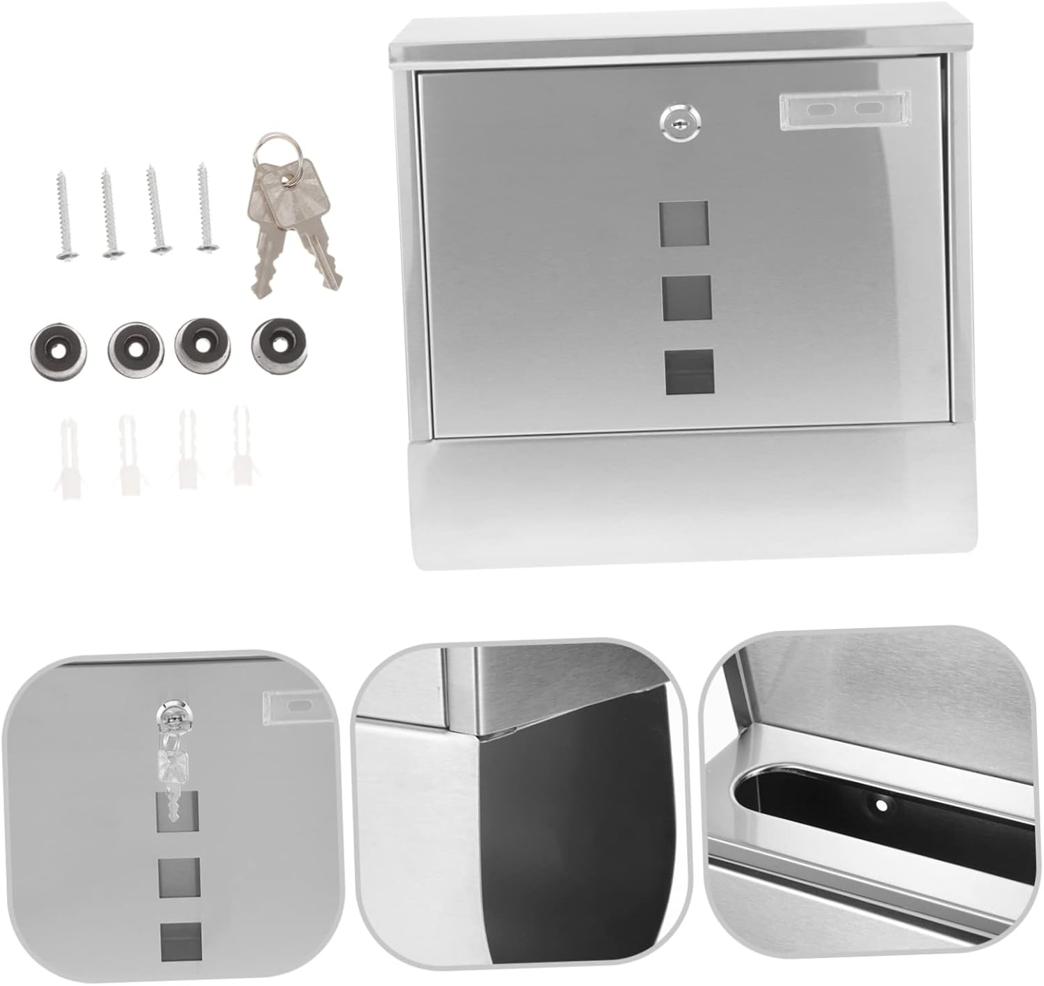 Package Include 1 x mailbox Features -Color:Silver lockable mailboxes for outside -Material:Stainless steel -Size:32.00X30.00X8.50cm/12.58X11.79X3.34in office mailbox -The wall mounted mailbox is well polished, no burrs and does not hurt hands when used stainless steel mailbox. -The mailbox provides the solution for convenient and secure lockable mailbox. -With a proper storage capacity, you can put many mails and letters what you need door mailbox. -Simple style letter box, it can be installed easily and convenient to take out your letter wall mount locking mailbox. -Made of stainless steel material, the mailbox is durable and sturdy, safe and locking .Goods Descriptionlocked mailbox If you are looking for a wall-mounted mailbox, then your research is over here.home mailbox It is not easy to get deformed and bring you much convenience.mailbox with lock for outside Adopted of stainless steel material, it is practical and durable for long time use.wall mount locking mailbox That's because our mailbox can meet your need