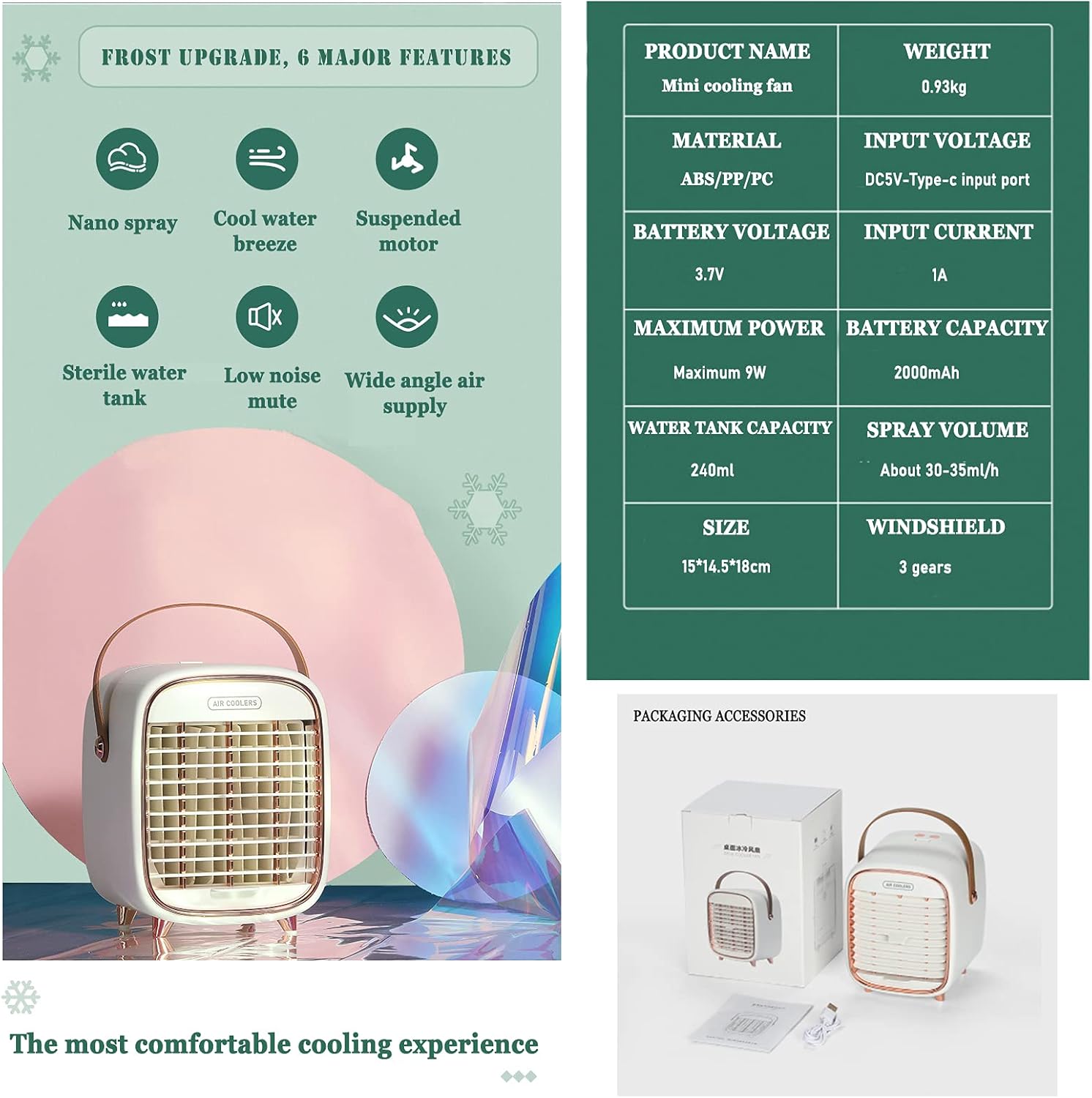 In the hot summer, you need a portable and compact air cooler to provide you with a cold summer.Our multi-functional portable air cooler is perfect for your requirements. Specifications: Color: white, green Whether to bring USB: Yes Switch type: piano button Additional function: spray Size: 15*14.5*18cm Shape: square Style: Vintage Power supply mode: USB Noise: 36dB or less Built-in battery capacity: 2000mA Wind speed gear: 3 Whether built-in battery: Yes Features: Enjoy Cool, Clean Air Anywhere. Simply fill with water, plug it into any standard wall outlet or USB port . This whisper-quiet fan and soothing night light make it perfect to use throughout the night for a comfortable sleep. It?s lightweight & even convenient for travel! Great for outdoors too! It?s not just safe to use but energy efficient. This personal space air cooler actually cools the air around you, where you need it most, while using the size and power consumption of a small fan. What's inside the box? 1 x Air Cooler 1 x USB Line 1 x Manual