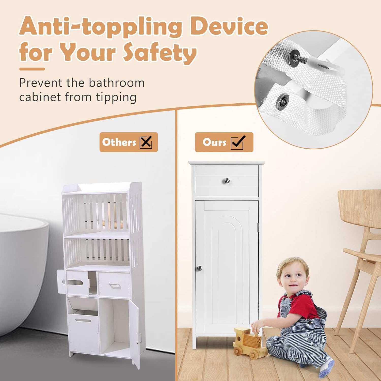 Description:Our bathroom floor cabinet offers ample storage space and a sophisticated look, combining beauty and practicality.The freestanding cabinet is equipped with one drawer and two shelves inside. The height of the shelves are adjustable so you can make more rational use of the space inside the cabinet. Large items can have their space inside. The organizer is made of MDF with lacquered surface for long life and providing good load capacity. With a modern style and compact design, this cabinet can be integrated into different decoration styles and used freely in any room. Just add your home with more harm!Features:Sufficient inner space for daily necessities storageAnti-tipping device to provide more safetyAdjustable shelf height for more reasonable use of space inside the cabinetDoor and drawer to avoid dust accumulation and to protect personal privacyTwo smooth metal knobs for more convenient usingPremium material for better weight capacity and long-time useWide applications such as kitchen cabinet, storage cabinet, etcHassle-free and time-saving installation and cleaningSpecifications:Color: Black/ Brown/ Grey/ WhiteMaterial: MDFOverall Dimension: 14” x 12” x 34.5” (L x W x H)Weight Capacity of Top: 44 lbsWeight Capacity of Drawer: 11 lbsWeight Capacity of Shelf: 17.5 lbsNet Weight: 20 lbsPackage Includes:1 x Bathroom Floor Cabinet1 x User Guide