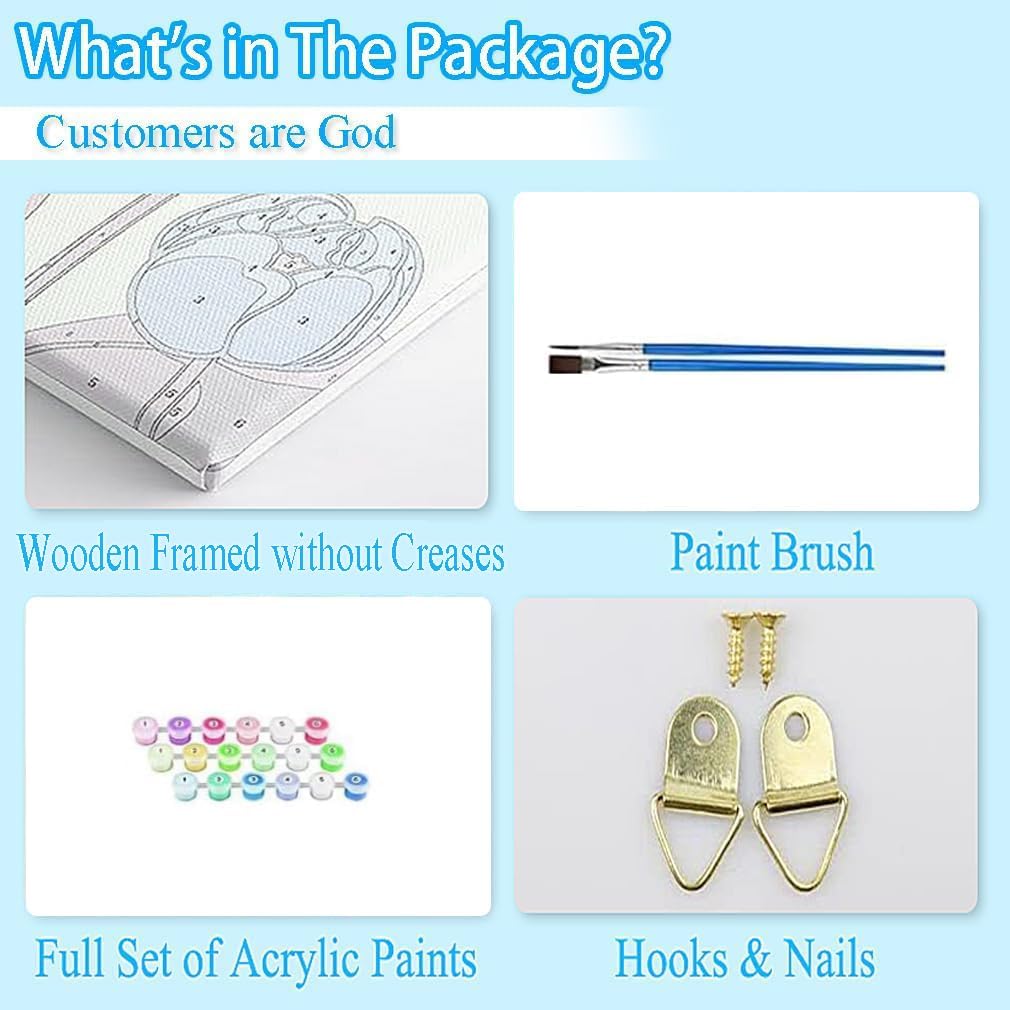 The advantages of painting by numbers 💎 The sense of achievement and the joy. 💎 Adults reduce stress by focusing on painting. 💎 Improvement of color assignment, concentration and drawing skills. 💎 Enrich your free time and enjoy a fun painting session with family or friends. 💎 Artwork to decorate your living room, bedroom, office or dining room. 💎 Ideal as a gift for family or friends for Christmas, Thanksgiving and birthdays. · Painting by numbers adults set is an ideal entry into the joy of painting, regardless of experience or age. · It is the perfect first step for beginners to enjoy the painting artwork. · Simply apply the numbered colors in the blanks with the same number on the canvas to create your own masterpiece. · It provides all basic painting skills,a sense of performance and entertainment. · It will be your own masterpiece to collect. · This great painting by numbers set can even be framed to make a fantastic picture for your wall. Article specifications:· Unfold size: 8x12" (20x30cm) ·Frame:not included · Features: DIY, Leisure,Fun,Artistic,Environmentally Friendly Instructions: · Clear an area to work. Please keep the area you are painting clean. You can also prepare a bottle of water to wash the brush. · Fill in the corresponding numbers on the canvas with color-coded numbers for painting. · Paint one color after another, from the largest area of this color to the smallest, starting with the upper part of the image. Clean the brush when switching to a different color. · Waiting for the paint to dry on the canvas. Warm tips ✔ If you have filled in the wrong color,you can wait until the color has dried, and then cover the wrong place with the right color on the surface. ✔ Please cover the lid of the paint well when not using it, so that the paint does not dry out. ✔ If you have the color on your clothes,please wash them immediately. ✔ Small measurement errors are allowed in the normal range. ✔ The color may differ slightly from the online image due to monitor color settings.