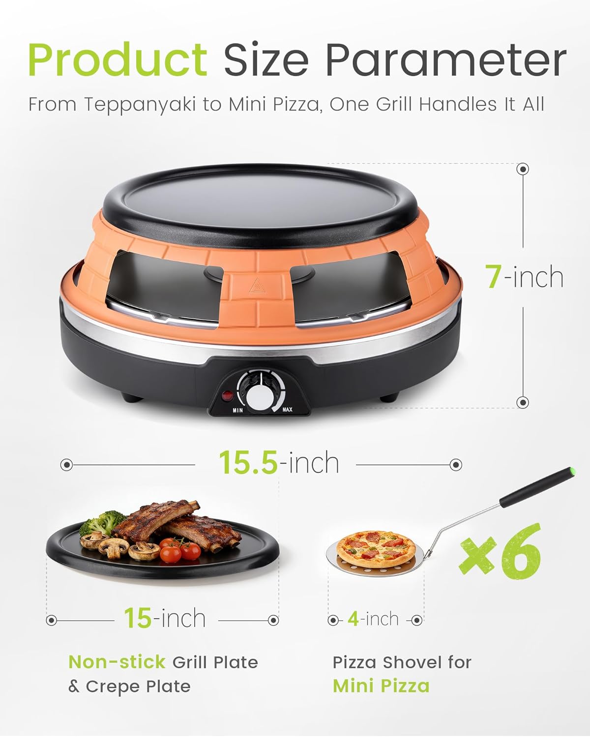 | Included Components | 4-inch Pizza Peel with Handle, Electric Pizza Oven, Non-stick Grill Plate |