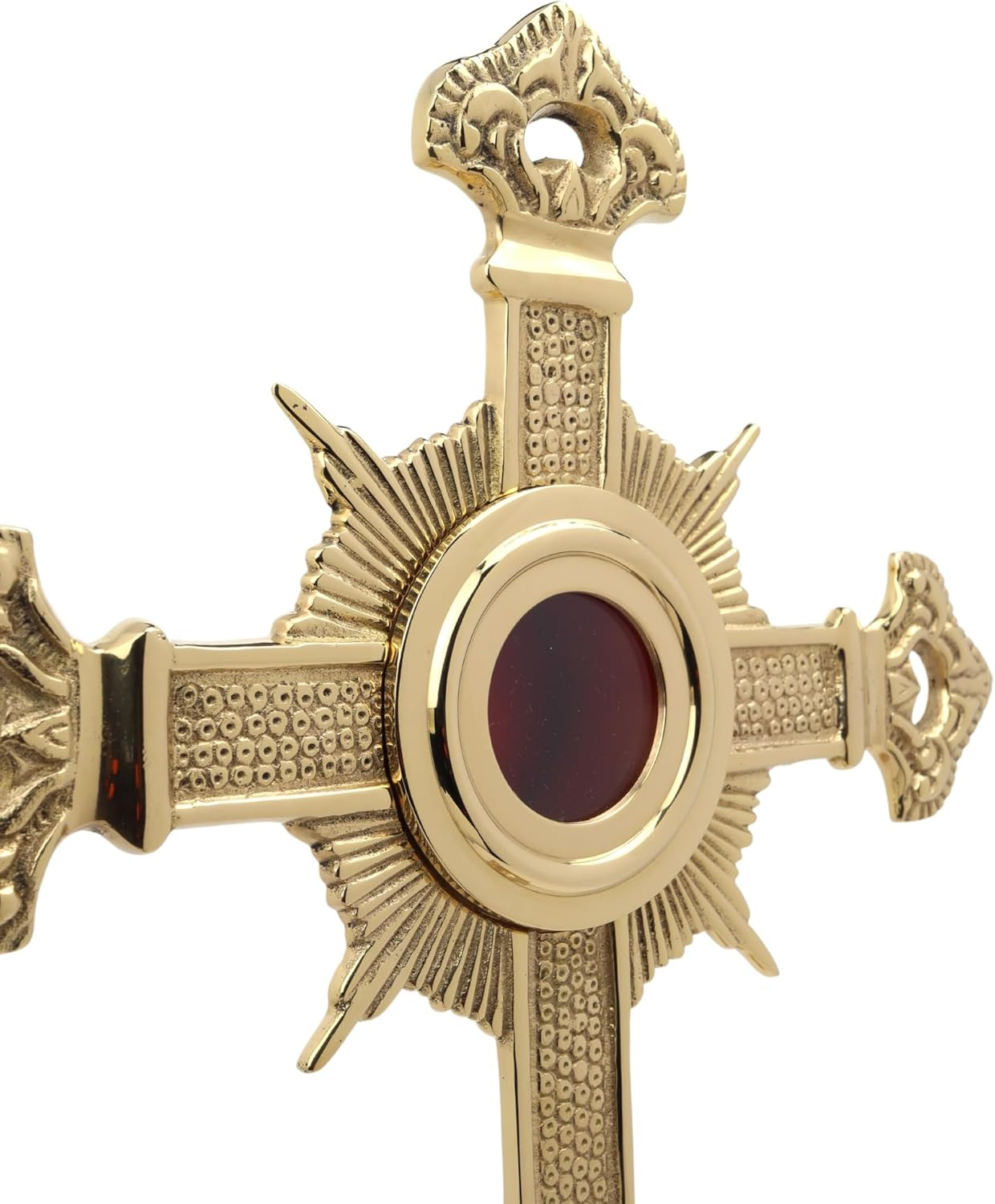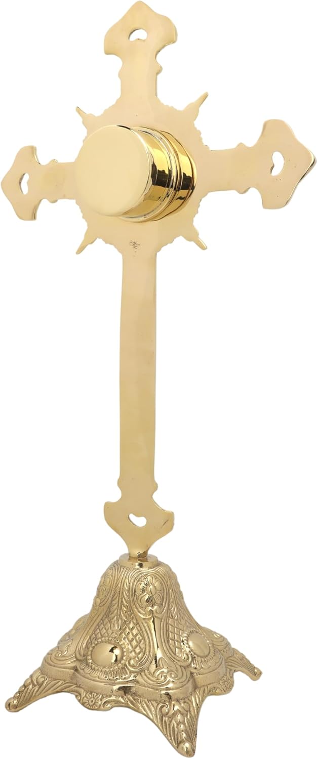 Add to the sanctity of your space with the Exquisite Brass Cross Reliquary, meticulously designed for the purpose of displaying sacred relics and keepsakes. This stunning religious decor piece not only adds to the aesthetic charm of your home or church but also serves as a symbol of faith and reverence. With its substantial dimensions measuring 16 by 8.5 inches, it commands attention and becomes a prominent, eye-catching focal point. Whether placed in a religious or spiritual setting, this reliquary holds deep meaning and represents the devotion of those who gather around it. It provides an ideal platform for showcasing and venerating cherished relics and keepsakes, all while exuding an air of elegance and devotion.