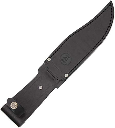 11 7/8" overall. 7" blade. Acero AN-58 Inox steel bowie style clip blade. Full tang. Finger grooved natural olive wood handles. Black finish steel guard, pommel, trim, and inlay shield. Black leather belt sheath.