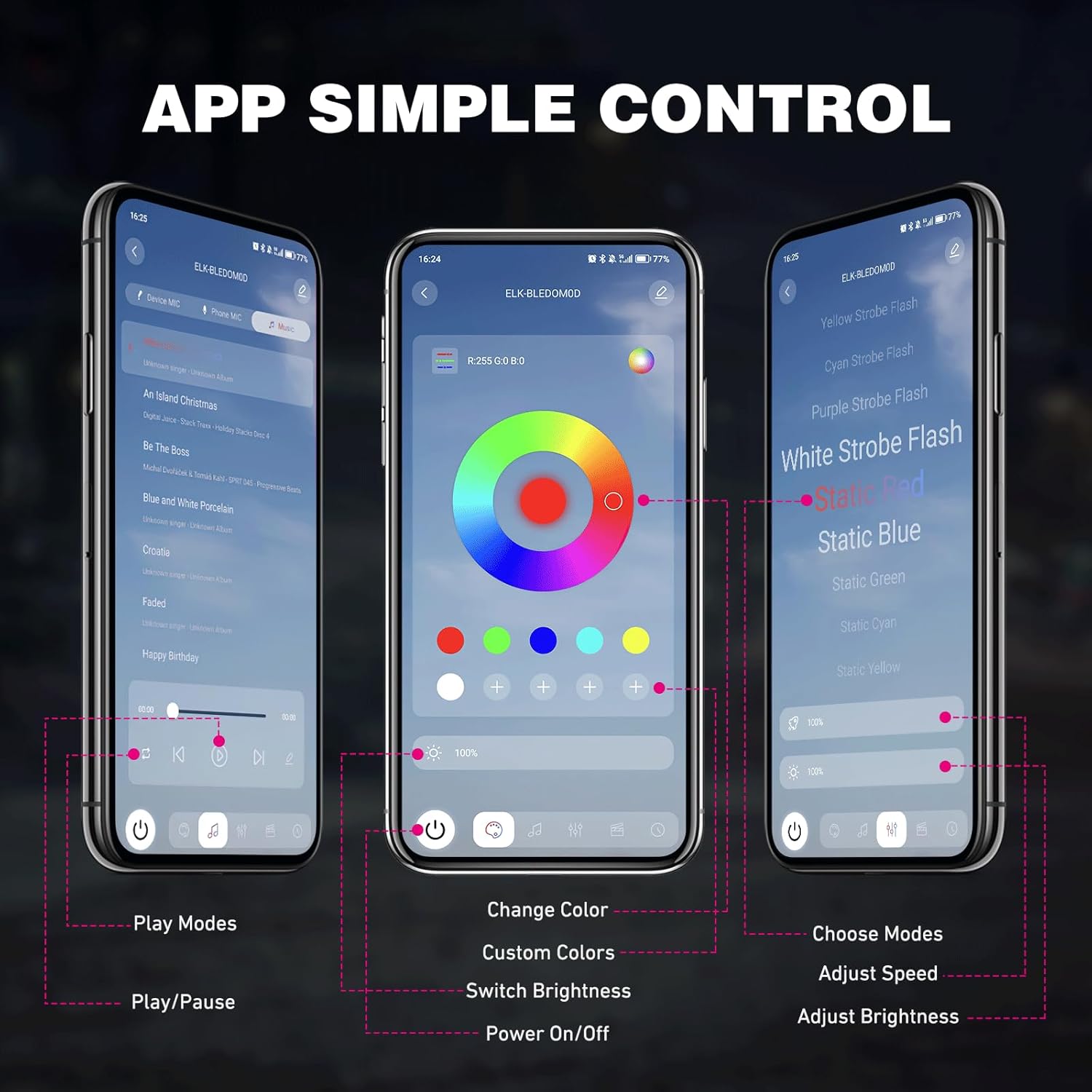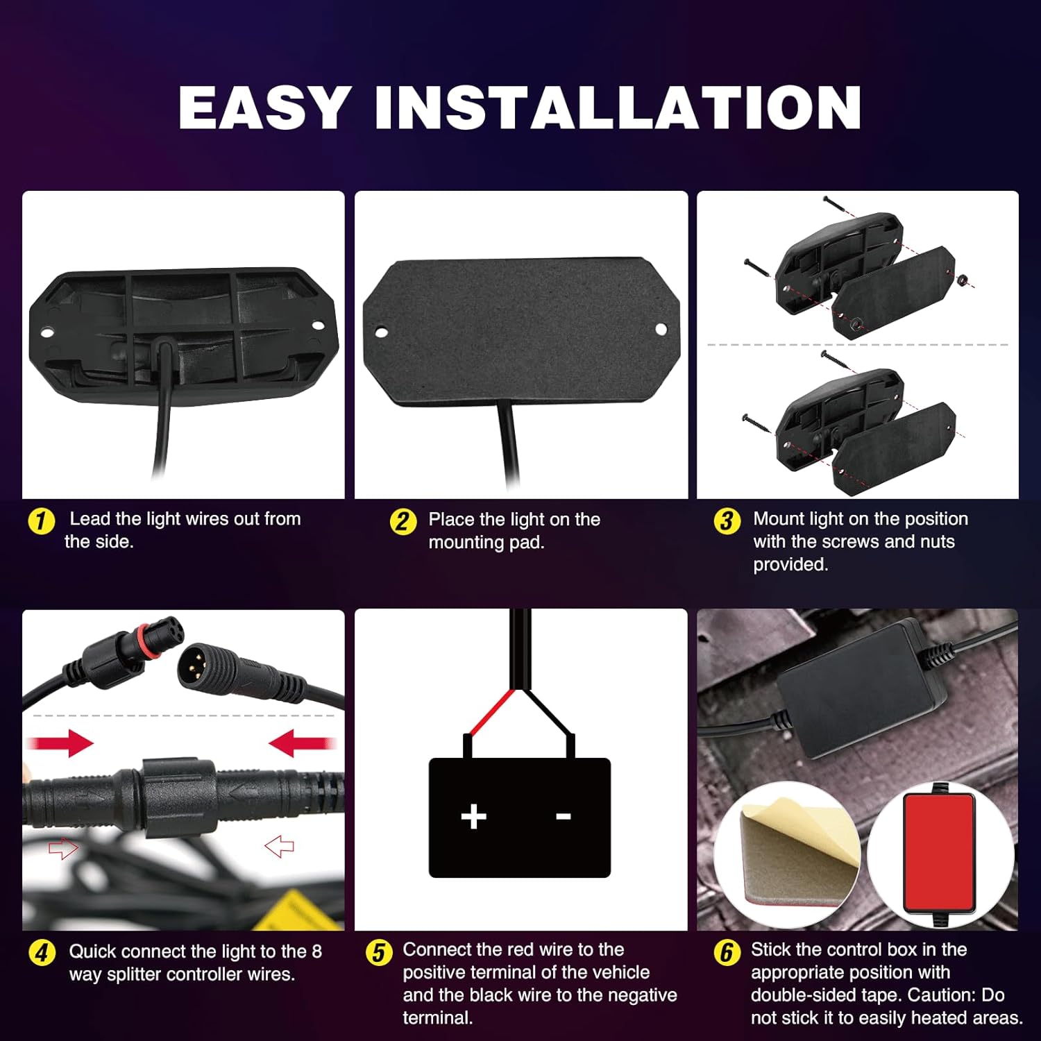 | Included Components | 8 x sets of rock lights with 117” wire, 8 x pcs sponge pad, 1 x 8 way splitter controller box with switch , 2 x remote, 1x zip ties kit and 1x user manual |
