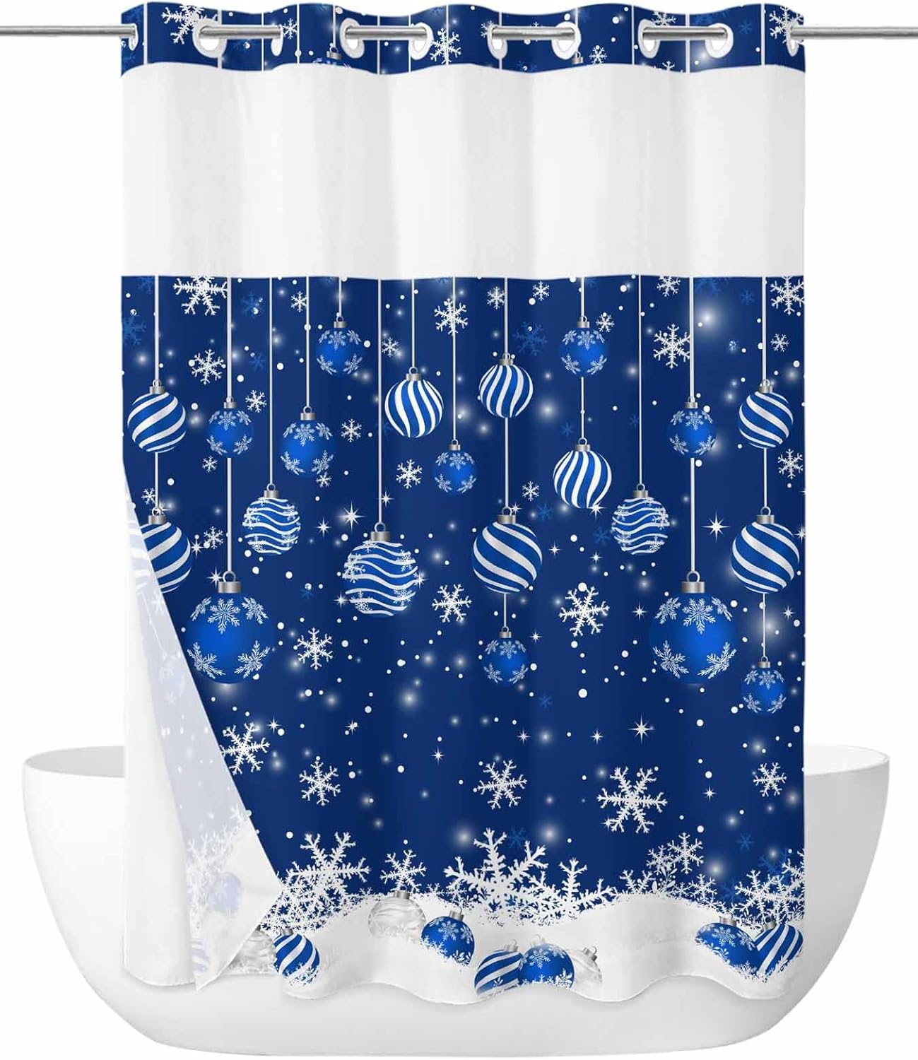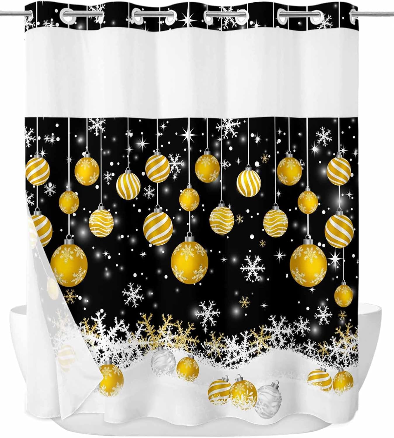 Enjoy Your Shower Time with Our Christmas No Hook Shower Curtain, Creating a Spa Shower Experience.Size:36" W x 72" L = 91x183 CM (6 x split rings 6 x snap)54" W x 78" L = 137x198 CM (6 x split rings 8 x snap)60" W x 72" L = 152x183 CM (8 x split rings 10 x snap)66" W x 72" L = 168x183 CM (8 x split rings 10 x snap)72" W x 72" L = 183x183 CM (10 x split rings 12 x snap)72" W x 78" L = 183x198 CM (10 x split rings 12 x snap)72" W x 84" L = 183x214 CM (10 x split rings 12 x snap)72" W x 96" L = 183x244 CM (10 x split rings 12 x snap)Double Layer With MagnetNo Hook shower curtain with built-in fabric liner, effortlessly to snap on/off the liner for washing and create a better visual experience.The double layers provide extra durability, magnets at the bottom help keep in place and ensure the curtain stays securely in place while showering.Water Repellent & Quick DryBoth outer curtain and liner are made of premium 5148% polyester, slide off water and dries quickly, let water stay on the surface, keep your bathroom tidy and fresh.No Hook & Easy InstallationHook Free Design and snap-in design effortlessly hook up the shower curtain on the rod within seconds. no extra hooks are required. Easy to install and convenient.See ThroughThe see-through sheer window on the top of the curtain gives you a bright showering space with plenty of air circulation while keeping privacy.Fine Stitching HemSew along all edges to prevent tearing, and durability throughout long-term use.Warm TipMachine washable, gentle cycle. Do not bleach, low iron.Please measure correctly before purchasing to avoid size issues.