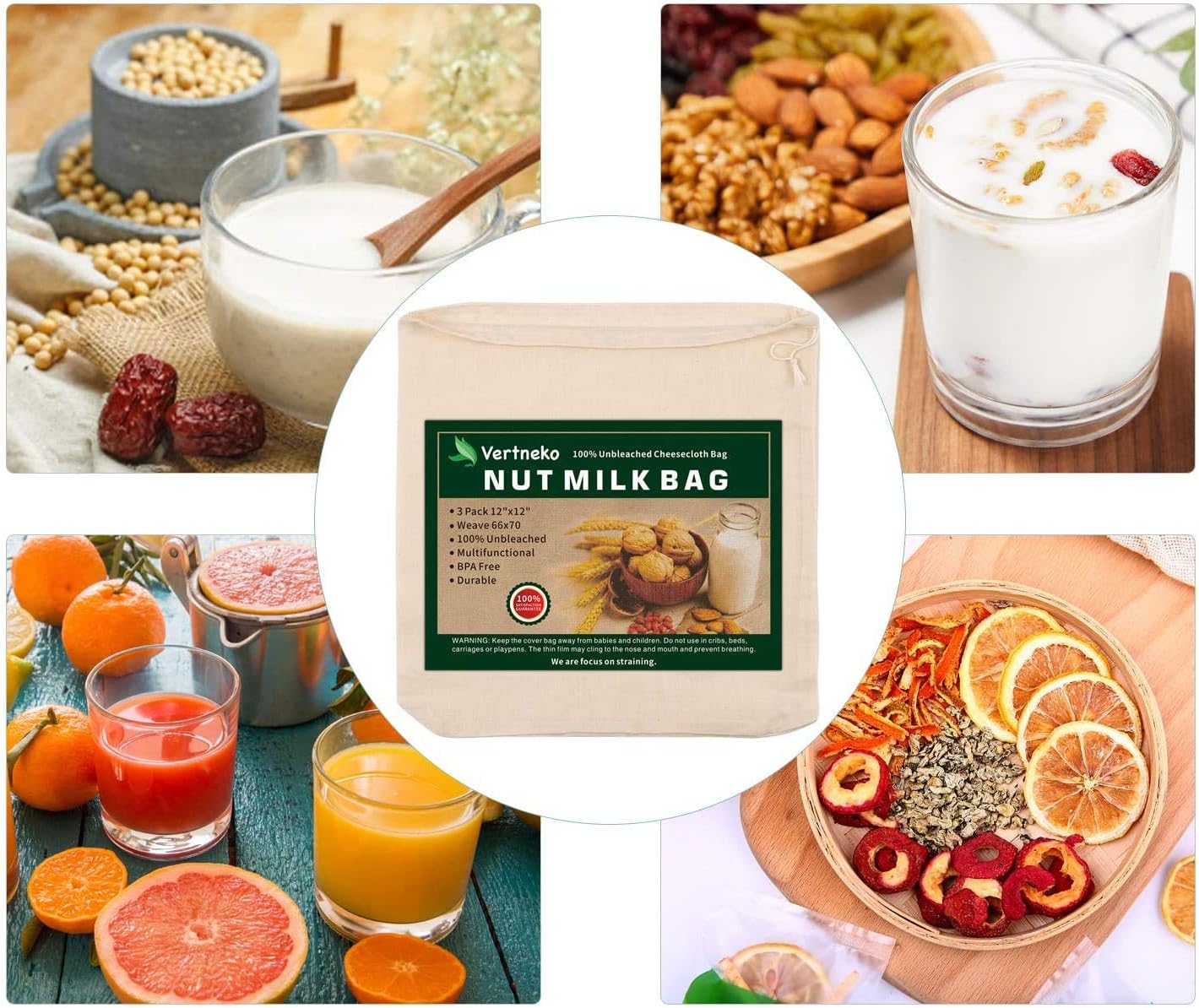 Quantity: 3 Pack Size: 12" x 12" (30 cm x 30 cm) Choose Vertneko Nut Milk Bags, Changing and Enriching Your Diet! Choose Vertneko Nut Milk Bags, Choosing a Healthy and simple Life! Nut milk & almond milk are healthy dairy substitutes that you can now easily make in your home! Our Bag is the way to go about it. It is a true 5-star product preferred by chefs & natural food lovers. Our high-quality seamless nut milk bags are good awesome vita/cashew milk makers. They are good nut filtration bags for making milk. Unbleached Cotton Material Our nut milk bags are made of 100% natural unbleached cotton. You needn't have to worry about the stimulation of chemical additives, and you needn't have to consider the unnatural factors of pollution. It fully enjoys sunbathing, nature care, so the nut milk bags we produced have high- health quality, and have green, ecological and environmental characteristics. It also has passed SGS Certified. Reusable & Durable & Washable Our nut milk bag is reusable.You just turn the bag inside out and hand wash with warm soap as soon as you are done, rinse and let them dry. You can also machine wash the bags. After-Sale Service Life-time friendly customer service. If anything not satisfied, contact us, we will help you to deal with it immediately, and you will get a full refund, no questions asked! Brand Vertneko is an environmentally friendly and stylish brand. We bring high-quality home and business environmental products to our customers through intelligent design and innovation.