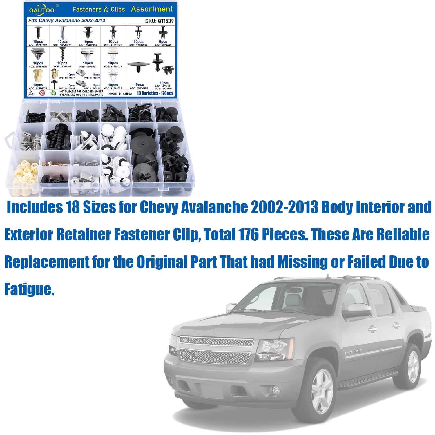 1 ๐ด OEM#10121502 Black Nylon Battery Post Cable Shield, Engine Splash Shield Retainer Top Head Diameter: 18mm Stem Length: 28mm Stem Diameter: 7.6mm 2 ๐ด OEM#10146315 Gray Nylon Wheel Opening Moulding, Cowl, Fende Flare, Front Bumper Retainer Top Head Diameter: 17.6mm Stem Length: 36mm Stem Diameter: 7.6mm 3 ๐ด OEM#11612035 Black Nylon Front Fender & Body Side Liner Push-Type Retainer Head Diameter: 20mm Stem Length: 12mm Fits into 8.5mm Hole 4 ๐ด OEM#11561878 Black Nylon Bumper, Fender Liner, Cowl, Grille, Air Inlet Duct, Rocker Panel, Wheel Liner, Quarter Panel & Upper Deflector Push-Type Retainer with Sealer Head Diameter: 15mm Stem Length: 21mm Fits into 8mm Hole 5 ๐ด OEM#11589294 Black Nylon Bumper Fascia, Fender and Toe/Floor Panel Push-Type Retainer Head Diameter: 20mm Stem Length: 24mm Panel Range: 7.0mm - 10.0mm Fits into 8.5mm Hole 6 ๐ด OEM#5973400 Black Nylon Fascia Retainer Head Diameter: 1โ, Shoulder Length: 1/8โ Stem Length: 3/4โ, Fits into 1/2โ Hole 7 ๐ด OEM#25693852 Gray Nylon Rocker Panel Moulding Clip Top Head Size: 9/16โ x 3/4โ Bottom Head Size: 5/8โ x 3/4โ Stem Length: 9/16โ Fits into 7/16โ Hole 8 ๐ด OEM#25705182 Black Nylon M9.5 x 46mm Bumper Fascia Nylon Screw Head Diameter: 22mm Square Drive 9 ๐ด OEM#11518357 White Nylon Rocker Panel Moulding Clip with Sealer Top Head Size: 9/16โ x 13/16โ Bottom Head Size: 13/16โ x 13/16โ Stem Length: 9/16โ Fits into 7/16โ Hole 10 ๐ด OEM#11519031 White Nylon Door Panel Retainer with Sealer Top Head Diameter: 19.4mm Bottom Head Diameter: 18.8mm Stem Length: 17mm Stem Diameter: 11mm Overall Length: 26mm 11 ๐ด OEM#11570830 White Nylon Fog Light Grommet Head Diameter: 16mm Stem Length: 16mm Overall Length: 20mm Fits into 11mm Hole 12 ๐ด OEM#11588650 Black Garnish Moulding, A-Pillar & Trunk Trim Fastener Width: 1/2โ Height: 5/8โ 13 ๐ด OEM#11513599 Zinc Organic Locking Thread Screw Size: M4.2-1.41 (#8) Panel Range: .65mm-3.8mm (.025โ-.150โ) Center of Hole to Edge: 9.5mm (3/8โ) 14 ๐ด OEM#11570498 Black Zinc M4.2-1.41 x 20mm Hex Head Tapping Screw Hex: 7mm Washer O.D.: 17mm 15 ๐ด OEM#11515638 Zinc Organic Locking Thread Metric Extruded U-Nut Screw Size: M4.2-1.41 (#8) Panel Range: 0.65mm-3.8mm(.025โ-.150โ) Center of Hole to Edge: 15mm 16 ๐ด OEM#11519032 White Nylon Door Trim Panel Clip Top Head Diameter: 19mm Bottom Head Diameter: 19mm Stem Length: 17.5mm Stem Diameter: 11.2mm 17 ๐ด OEM#20064875 Black Nylon Hood Insulation Retainer Top Head Diameter: 41.5mm Stem Length: 19m Stem Diameter: 7.6mm 18 ๐ด OEM#15733971 Black Nylon Front Air Deflector Push-Type Retainer Top Head Diameter: 18mm Bottom Head Diameter: 26mm Flange Diameter: 30mm Stem Length: 24mm ๐ด OEM#15733970 Black Nylon Front Air Deflector Grommet Head Diameter: 28mm Stem Length: 13mm
