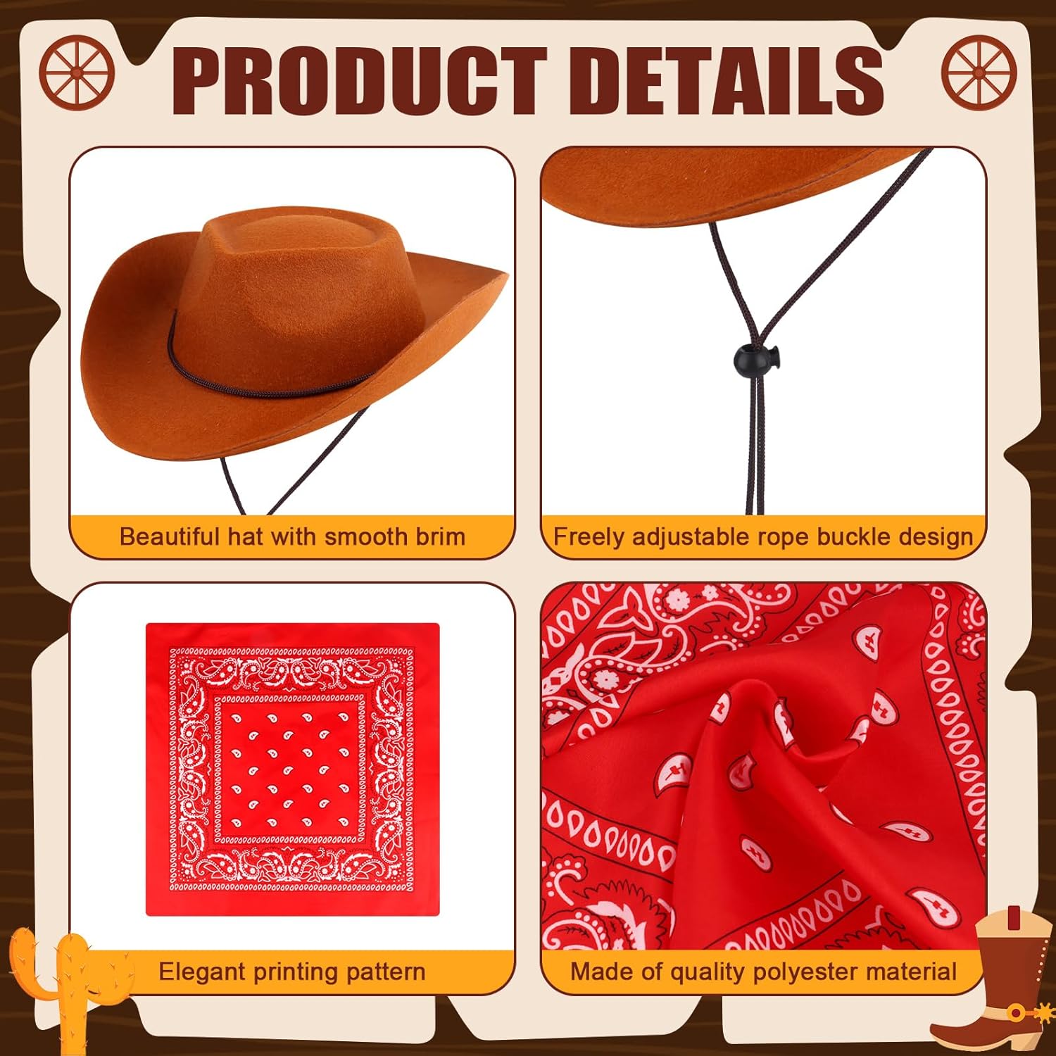 Western Cowboy Decoration Set--You will receive 12pcs cowboy party hats,12pcs inflatable stick horses and 12pcs paisley bandanas for a complete cowboy themed party,not only suitable for daily use,but also for your decoration and role play needs.Product Size--These cowboy hats are about 12.6 x 11 x 3.2 inches/ 32 x 28 x 8 cm,inflatable horse stick is about 13 x 37.8 inches/ 33 x 96 cm,paisley bandanas measure about 21 x 21 inches/ 53 x 53 cm,can be applied as a handkerchief,scarf or gift wrap.Reliable Material--The surface of the cowgirl party hat is made of plastic and felt material,which is lightweight and soft,it will not make you feel stuffy when worn for a long time,and you can adjust its length.The cowgirl bandana is made of polyester material and you can hand wash it with cold water.Inflatable horse head stick is made of PVC.Classic Style Design--The felt cowboy party hat has a classic and charming edge curling design,which perfectly matches the paisley bandana.The horse head is printed with colors on both sides,and the details are rich and lively to help you complete your party.Cowboy cosplay.Wide Range of Use--Our cowboy hats party are suitable for a lot of applications and occasions,such as western theme day,cowboy and cowgirl day at school,western themed parties,horse dance performances,carnival celebrations,masquerade parties;It can also be applied as an accessory for everyday wear,cosplay accessories,photography or theatrical props.