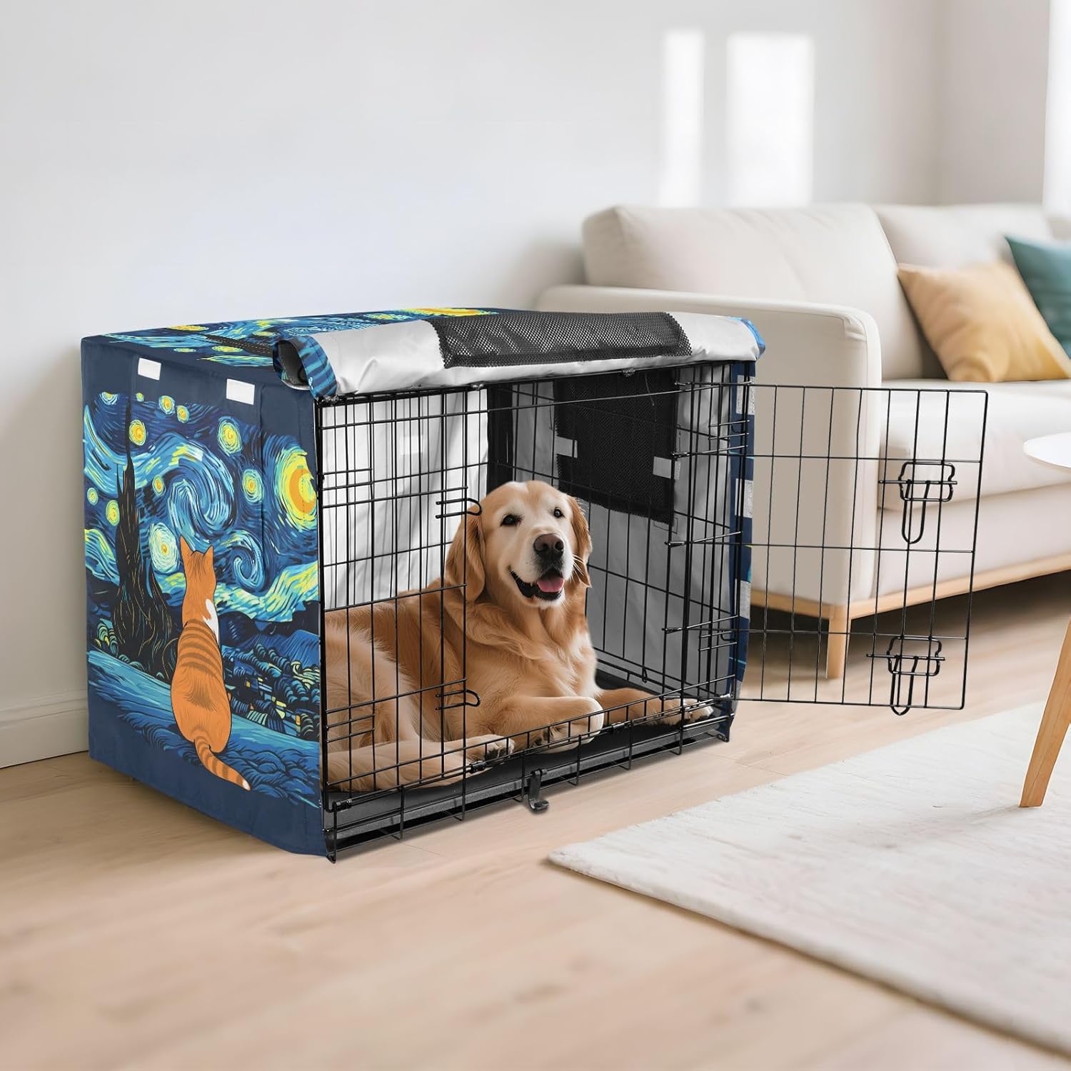 Protection – Made from 600D silver-coated oxford fabric, this indoor pet crate cover provides reliable protection against weather conditions, including wind and rain. It prevents your dog from scratching the crate and blocks harmful UV rays.Easy Installation – This dog kennel cover features a user-friendly fastening system, allowing for quick installation without tools. It securely attaches to your dog crate, ensuring it stays in place for continuous protection.Effective Ventilation – Mesh windows on every side of the crate cover allow for steady airflow, keeping your dog comfortable and well-ventilated while inside. This design ensures your pet has a cool and breathable environment.Secure Fit – Equipped with four tie-down straps, the cover stays firmly in place, preventing it from shifting or being blown away. This added stability makes it suitable for outdoor use even in windy conditions.Ideal for Multiple Uses – This versatile travel crate cover is Ideal for both indoor and travel use. Whether you’re at home, on a road trip, or camping, it offers a practical solution for protecting your pet’s crate.