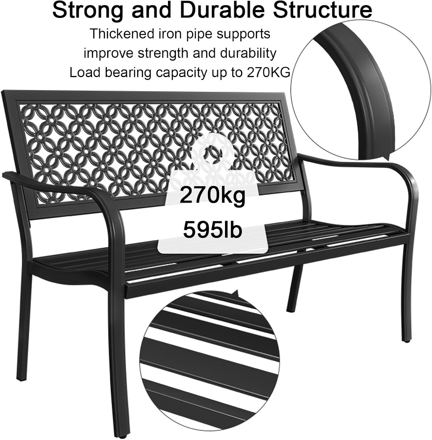 Park Bench:Enhance your outdoor experience with our stylish garden bench, designed to elevate the ambiance of your porch or backyard while providing a comfortable resting spot for family and friends. This elegant bench serves as a perfect addition to your patio decor, creating a tranquil space for relaxation and social gatherings.Constructed with a durable powder-coated steel frame, this garden bench is built to withstand the elements, ensuring longevity and resistance to weather conditions. Its sleek finish not only adds an attractive touch to your outdoor settings but also simplifies assembly, allowing you to enjoy your new furniture in no time.Designed with comfort in mind, the thoughtfully crafted armrests provide a supportive resting place for your arms, enhancing your overall sitting experience. The bench features a simple yet elegant backrest, making it an ideal fit for any patio or garden style.Our garden bench is equipped with adjustable non-slip legs, featuring plastic foot pads that protect your flooring and allow for balance adjustments on uneven surfaces. This thoughtful detail ensures stability and safety for all users.Specifications:- Height: 34" / 86cm- Length: 49" / 125.6cm- Seat Height: 14" / 36cm- Inner Leg Spacing: 24" / 61cm- Weight Capacity: 595lbs / 270kgIdeal for various outdoor spaces such as parks, courtyards, and terraces, this garden bench brings a touch of nature into your leisure time. For maintenance, simply wipe with a damp cloth and dry with a soft cloth.Package Includes:1 x Garden Bench1 x Installation Accessories1 x Backrest2 x Chair Legs