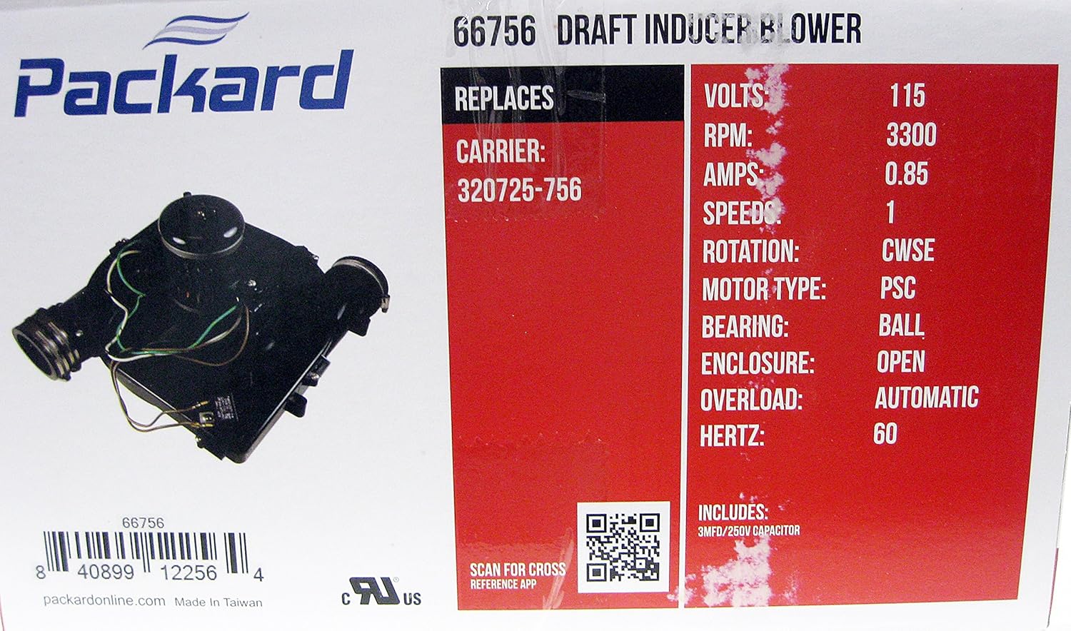 Packard Draft Inducer Motor: Part Number 66756 Specifications: Width (In. ): 13. 8 Height (In. ): 8. 5 Amps: 0. 85 Certifications: UL Bearings: Ball Enclosure: Open H. P. : 1/12 Hertz: 60 Includes: 2 Spd Plug, Blower Wheel, Cooling Fan, Screws, Capacitor (3 MFD x 270 vac) & Grommets Motor Type: PSC NEMA Frame: 3. 3 Overload Protection: Automatic RPM: 3300 Speeds: 1 UPC: 840899122564 Voltage: 115 Watts: 58 Replacement for Carrier Numbers: 1179081 320725-756 HC27CB115 JE1D013N
