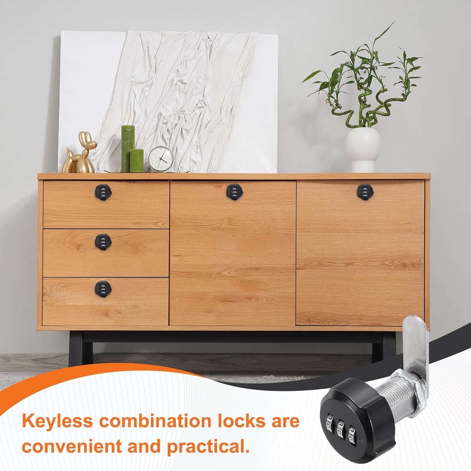 Keyless combination locks are suitable for filing cabinets, storage cabinets, shoe cabinets, drawers, safes, and doors, and are suitable for furniture, offices, and public areas where locks need to be added or replaced.SpecificationsLock Cylinder Length: 30mm / 1-1/8InchCompatible Plate Thickness: 15~22mm / 0.59 ~ 0.87 InchLock Tongue Length: 45 mm / 1- 49/64 InchHole Diameter: 19 mm / 3/4 InchInitial password: 000 (Can be reset)Packing List: 2 Pcs x Lock, 1 Pcs x Password PinAdvantageThe zinc alloy construction with chrome plating offers durability and corrosion resistance. Its resettable three-digit combination provides customizable security with multiple code options. The locks are easy to install without screws, directly fixing into the cabinet, and come with a lock accessory.InstructionTo set a new combination, press the reset hole with a small tool while rotating the dials to your desired code. Release to lock the new password. The default combination can be used for setup.Note: Verify the lock's cylinder dimensions match your cabinet specifications before installation.