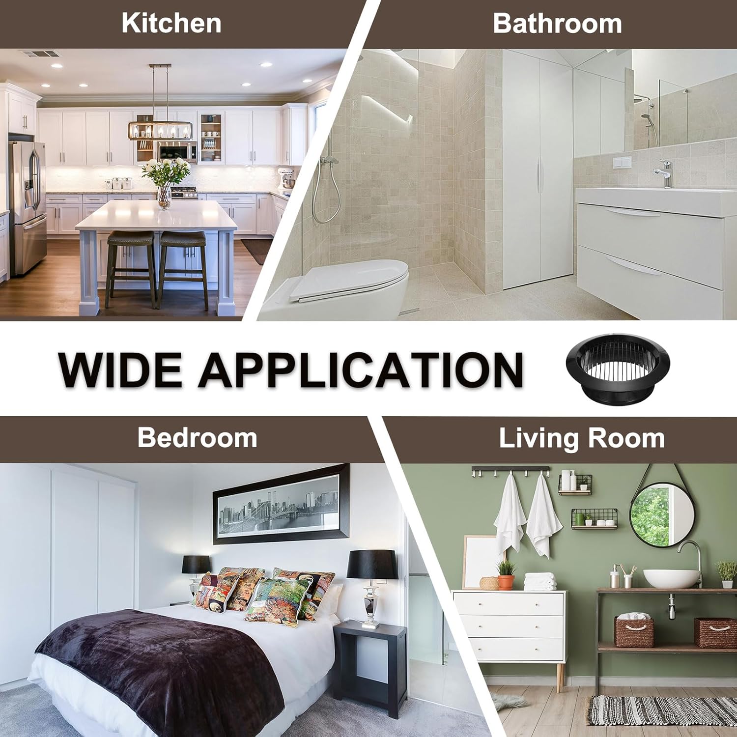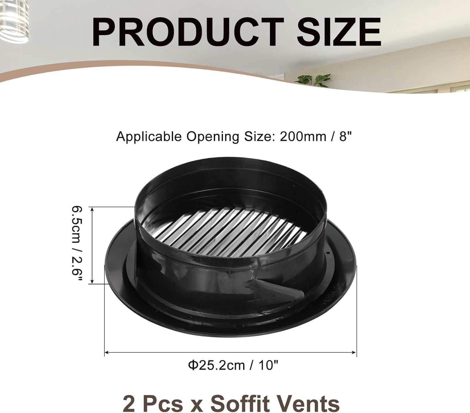 These multi-functional round attic vents can be utilized for air intake and exhaust, making them suitable for various indoor and outdoor settings including bedrooms, bathrooms, garages, chicken coops, and storage sheds.SpecificationMaterial: ABS PlasticTotal Size: 25.2 x 6.5 cm / 10 x 2.6 inch (Dia.*H)Applicable Opening Size: 200mm / 8 inchCompatible for 8 inch duct or wall hole and the ceiling holePacking List: 2 Pcs x Soffit VentsAdvantageCrafted from quality ABS material, sturdy, and not easy to age and color fade, this ceiling vent cover provides good durability against weather and collision. Its robustness against deformation and fading delivers a reliable home ventilation option.InstructionThe reverse buckle mechanism simplifies the process of installing the gable vent. Just insert the soffit vent cover into the pre-drilled hole on the wall or ceiling, and twist it to lock it securely in place - no complicated tools are required.NoticeIt is recommended to clean the vents regularly to maintain ventilation effectiveness. Avoid the vents being blocked by dust, debris, etc., affecting ventilation effectiveness.