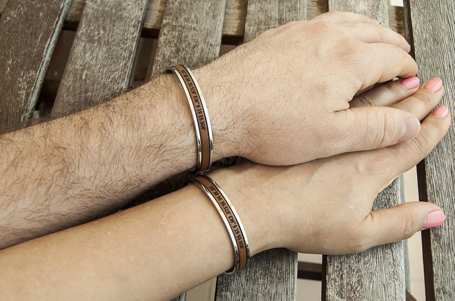 Set of 2 Matching Coordinate Bracelets - beautiful, simple, authentic stainless steel cuff with genuine leather inlay. You can engrave your own coordinates or any other message and make this a perfect, meaningful gift to be cherished for years. Cuff Width - 0.5cm (0.4in), the steel base measures 17.5 cm (6.7in) One size bracelet, will fit most wrists. Can be adjusted by bending slightly.Leather can be personalized with any coordinates or other info of your choice.Stainless Steel is hypoallergenic, extremely durable, will not rust or tarnish. It looks like expensive silver jewelry, has a nice weight to it, not hollow, nicely polished and has a beautiful shine. Perfect gift idea! Looks awesome with dressy outfits or casual wear. Sleek, elegant piece of modern minimalist jewelry. Choose your color and get these gorgeous bracelets NOW before we run out! Comes in a cute gift box. BeGenuine is an European brand known for it's quality and simple, clean design. ❤ Shop authentic ❤ Shop BeGenuine ❤