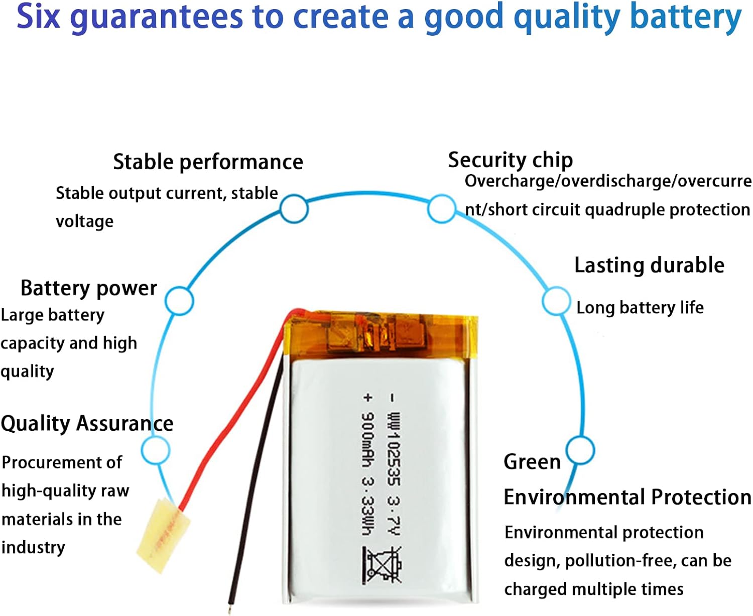 Polymer Battery Suitable for Bluetooth headsets, Bluetooth speakers, MP3, GPS, monitoring equipment, desk lamps, flashlights, walkie-talkies, wireless keyboards mice, VR glasses, beauty instruments, alarms, sweeping robots, small robots, blood pressure monitors, remote control cars, game consoles, cameras, electric toys, driving Recorder, etc.Basic Battery ParametersName: Lithium-polymer ion batteryModel: WW102535Voltage: 3.7VCapacity: 900mAhSize: 10*25*35mmBattery energy: 3.33WhMaterial: Plastic aluminum filmCharging voltage: 4.2VDischarge voltage: 2.75VMaximum current: 2CStorage temperature: -20~45℃Connector: (If you need a connector, please contact me)List2pcs 3.7V 900mAh Polymer Battery (Built-in Protection Board) (connector not included)